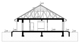 Wersja technologiczna: murowana - beton komórkowy. Izolacja termiczna ścian zewnętrznych: Termo Organika TERMONIUM FASADA / alternatywnie Gór-Stal płyta izolacyjna termPIR ETX. Strop: dolny pas wiązarów MITEK. Typ schodów: brak. Konstrukcja dachu: prefabrykowane wiązary drewniane MITEK Industries Polska. Pokrycie dachowe: blacha na rąbek stojący modułowa. Typ ogrzewania: Kocioł na gaz. Wentylacja: mechaniczna. Ściany zewnętrzne: 24 cm beton komórkowy Solbet Optimal. Ściany wewnętrzne: 24 cm beton komórkowy Solbet Optimal. Ściany wewnętrzne działowe: 12 cm beton komórkowy Solbet One. Wentylacja: mechaniczna Thessla Green.