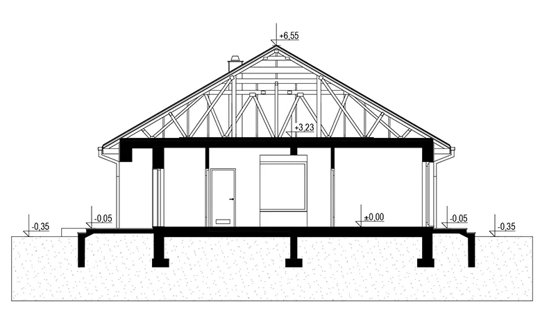 Wersja technologiczna: murowana - beton komórkowy. Izolacja termiczna ścian zewnętrznych: Termo Organika TERMONIUM FASADA. Strop: dolny pas wiązarów MITEK. Typ schodów: brak. Konstrukcja dachu: prefabrykowane wiązary drewniane MITEK Industries Polska. Pokrycie dachowe: blacha na rąbek stojący modułowa. Ściany zewnętrzne: 24 cm beton komórkowy Solbet Optimal. Ściany wewnętrzne: 24 cm beton komórkowy Solbet Opimal. Ściany wewnętrzne działowe: 12 cm beton komórkowy Solbet One. Wentylacja: mechaniczna Thessla Green.
