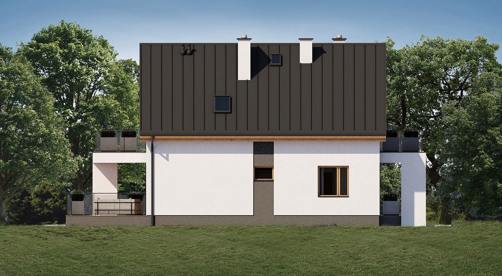 Graficzne opracowanie rzutów poglądowych widocznych na karcie projektu zostało wykonane przez Extradom.pl. Prezentowane przez Extradom.pl wizualizacje wykonane zostały przez autora projektu i należy poczytywać je jedynie za przykład i propozycję wykończenia, wizję architektoniczną autora projektu. Ostateczne wykończenie budynku może nastąpić na wiele sposobów. Szczegółowe rozwiązania zastosowane w oferowanej dokumentacji - w tym również ilość, lokalizacje i wygląd okien, drzwi, kominów - mogą w niewielkim stopniu różnić się od prezentowanej wizualizacji budynku.