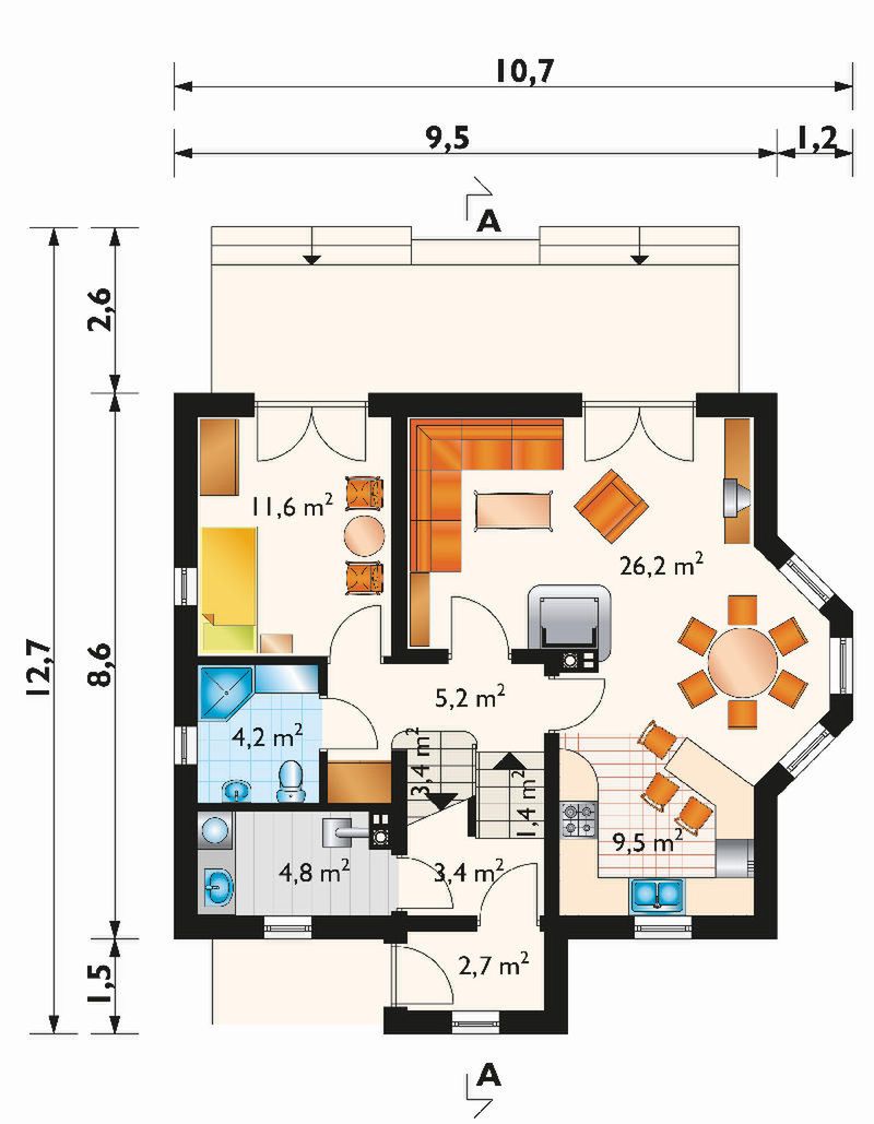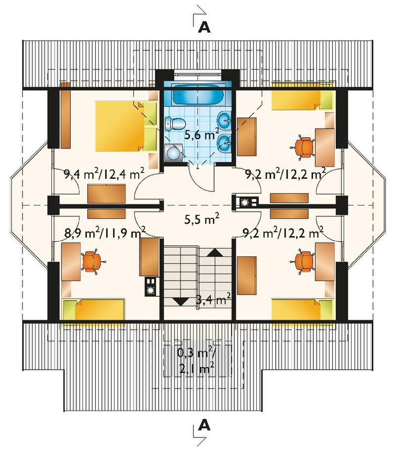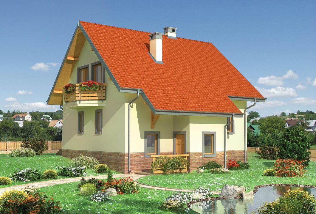 Graficzne opracowanie rzutów poglądowych widocznych na karcie projektu zostało wykonane przez Extradom.pl. Prezentowane przez Extradom.pl wizualizacje wykonane zostały przez autora projektu i należy poczytywać je jedynie za przykład i propozycję wykończenia, wizję architektoniczną autora projektu. Ostateczne wykończenie budynku może nastąpić na wiele sposobów. Szczegółowe rozwiązania zastosowane w oferowanej dokumentacji - w tym również ilość, lokalizacje i wygląd okien, drzwi, kominów - mogą w niewielkim stopniu różnić się od prezentowanej wizualizacji budynku.