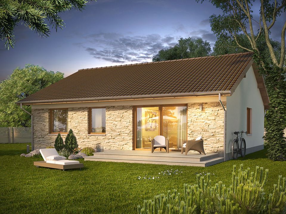 Budynek posiada ściany zaprojektowane z gazobetonu z warstwą ocieplenia oraz sufit podwieszony do więźby dachowej. Konstrukcja dachu wykonana jest z drewna, a materiał na jego pokrycie to dachówki ceramiczne lub cementowe. Ściany obłożone są tynkiem, na fragmentach zastosowano płytkę kamienną. Zmiany w zakresie zastosowanych materiałów możliwe są do wprowadzenia na etapie adaptacji.