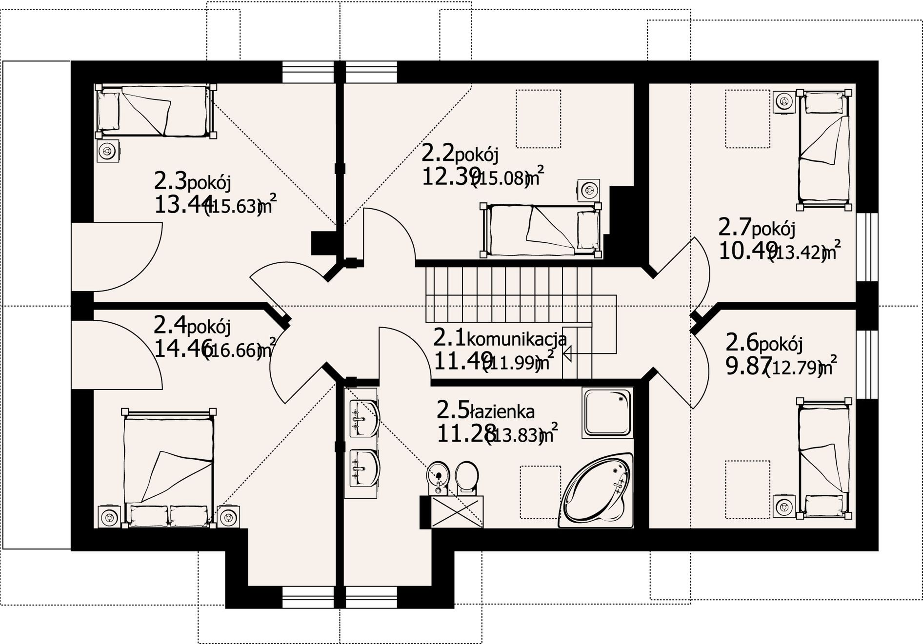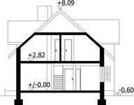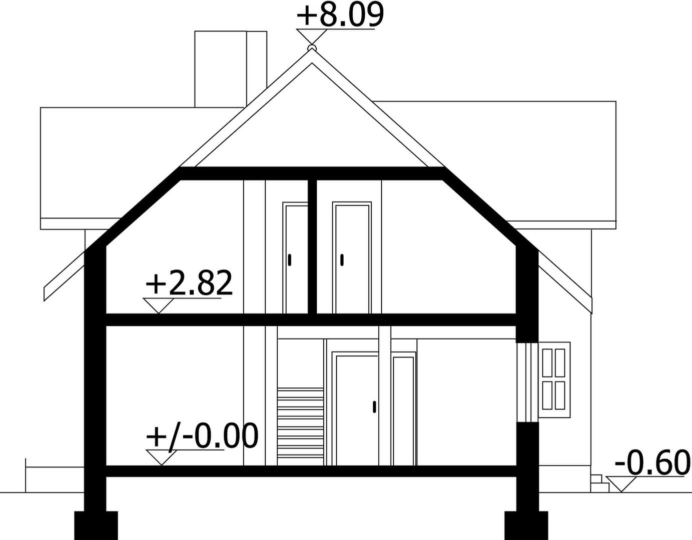 Wysokość ścianki kolankowej: 1.19 m. Strop: płyta żelbetowa. Pokrycie dachu: dachówka ceramiczna. Ściany zewnętrzne: pustaki ceramiczne + styropian. Ściany wewnętrzne: pustaki ceramiczne. Typ ogrzewania: kocioł gazowy lub kocioł na paliwo stałe. Inne: okna połaciowe Velux.