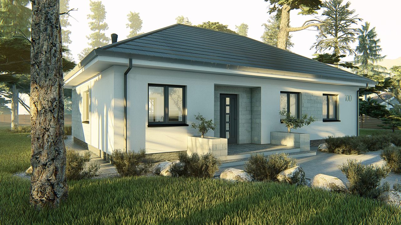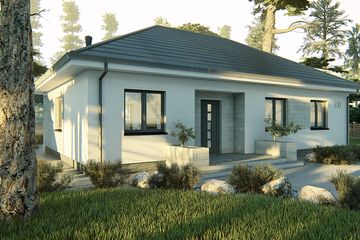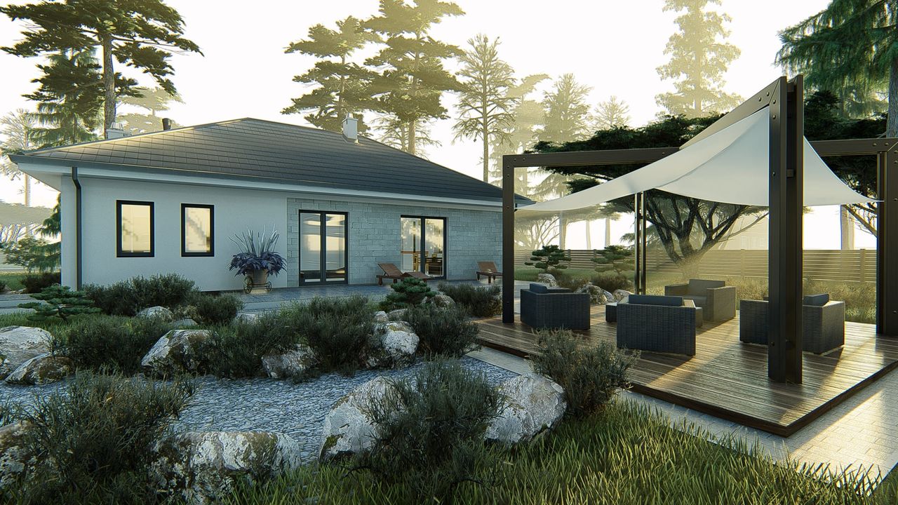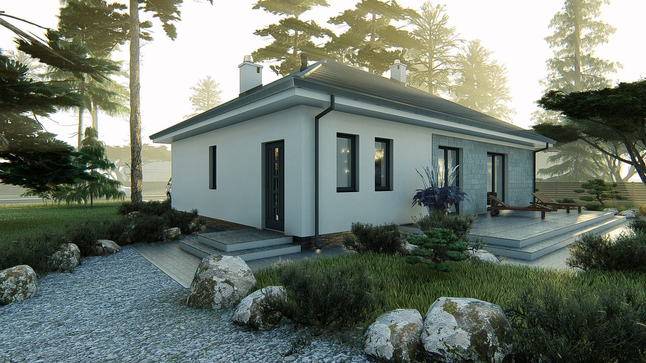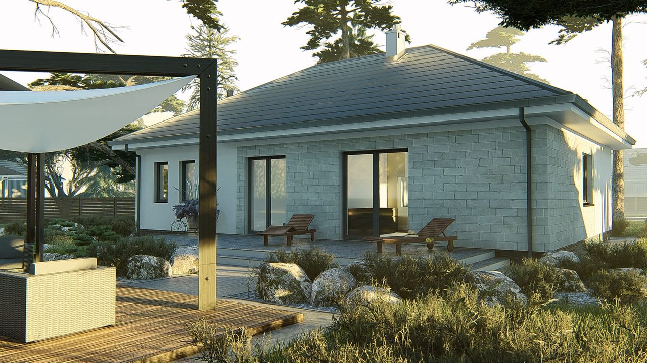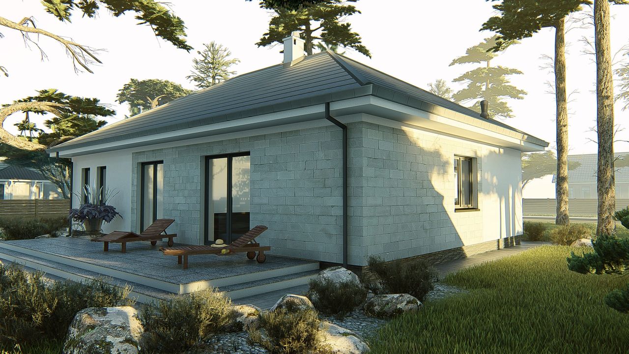 Graficzne opracowanie rzutów poglądowych widocznych na karcie projektu zostało wykonane przez Extradom.pl. Prezentowane przez Extradom.pl wizualizacje wykonane zostały przez autora projektu i należy poczytywać je jedynie za przykład i propozycję wykończenia, wizję architektoniczną autora projektu. Ostateczne wykończenie budynku może nastąpić na wiele sposobów. Szczegółowe rozwiązania zastosowane w oferowanej dokumentacji - w tym również ilość, lokalizacje i wygląd okien, drzwi, kominów - mogą w niewielkim stopniu różnić się od prezentowanej wizualizacji budynku.