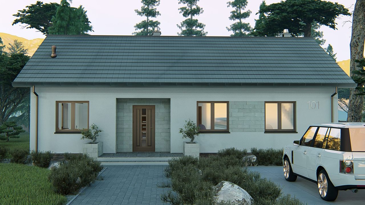 KP-101 to projekt parterowego domu w tradycyjnym stylu, stworzony z myślą o komforcie trzy- lub czteroosobowej rodziny. Prosta bryła z dwuspadowym dachem gwarantuje niskie koszty budowy, a funkcjonalny układ pomieszczeń na niemal 89 m² zapewnia wygodę codziennego życia w przytulnej, parterowej przestrzeni.