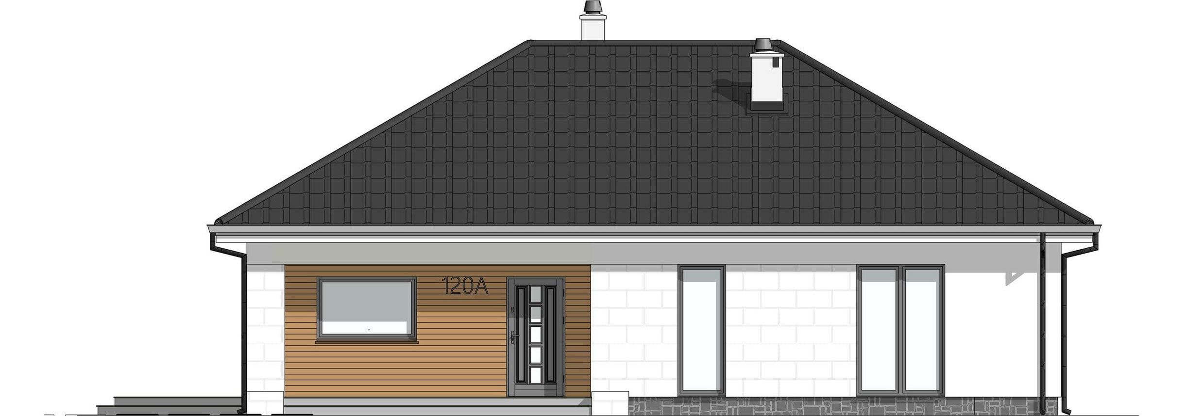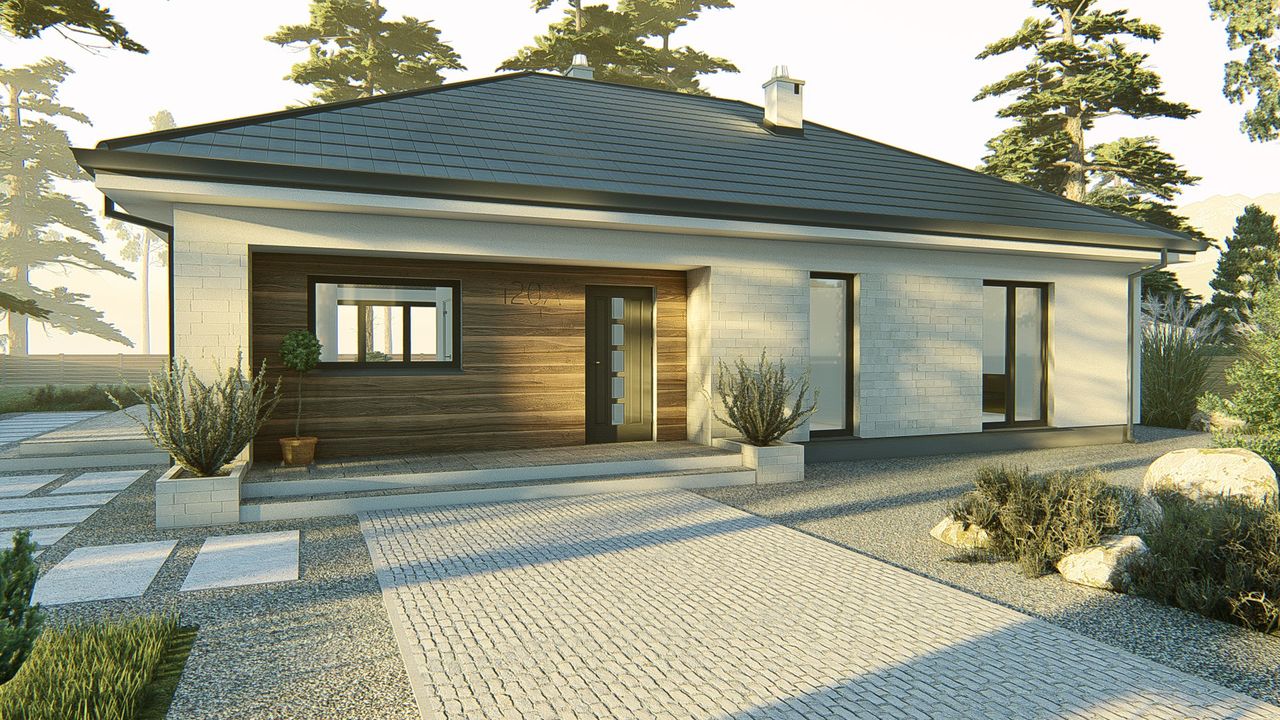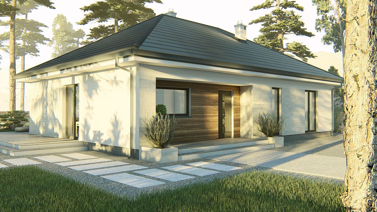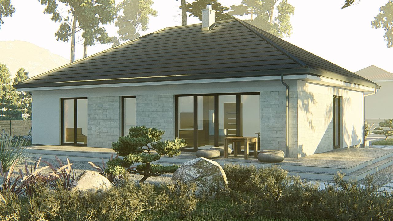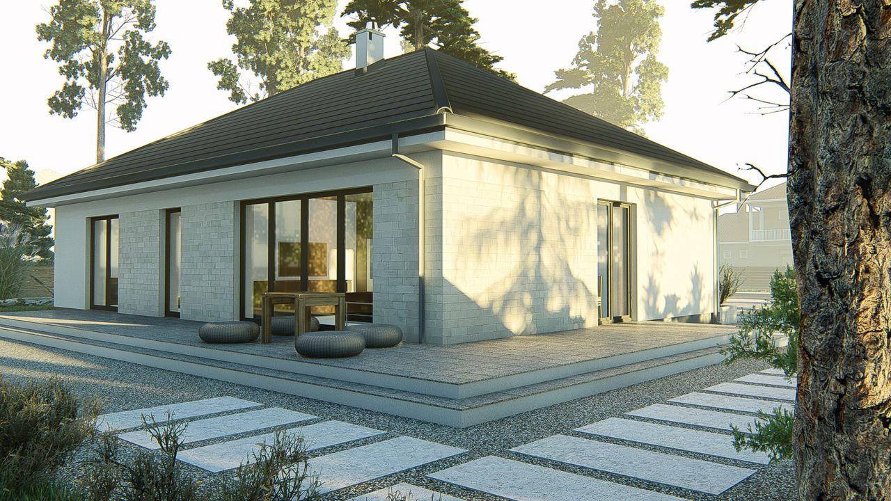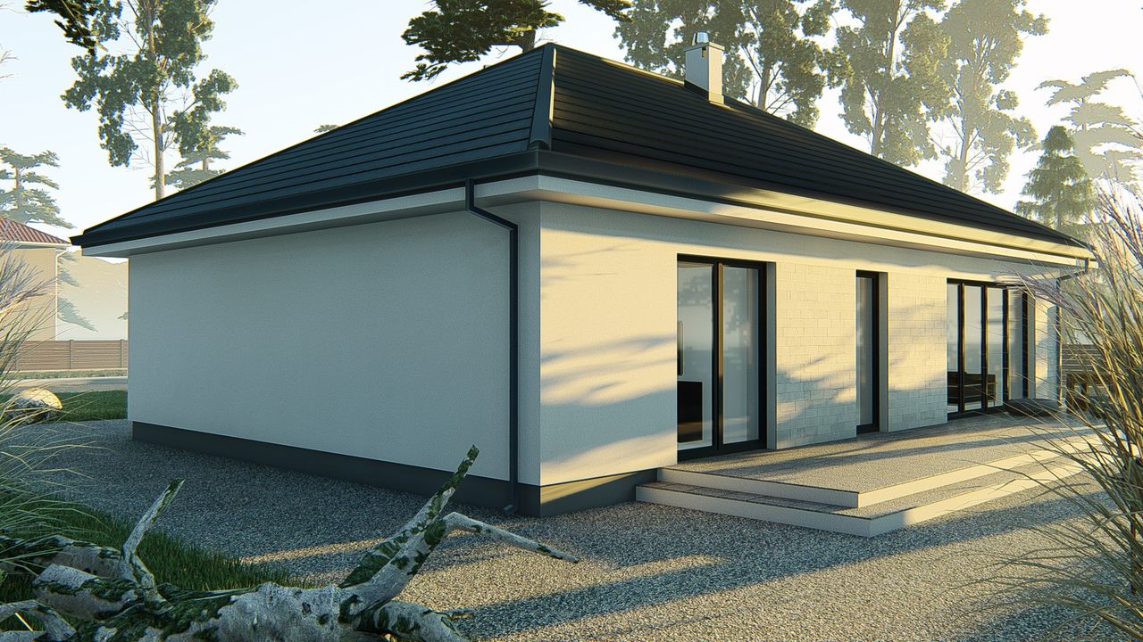 Graficzne opracowanie rzutów poglądowych widocznych na karcie projektu zostało wykonane przez Extradom.pl. Prezentowane przez Extradom.pl wizualizacje wykonane zostały przez autora projektu i należy poczytywać je jedynie za przykład i propozycję wykończenia, wizję architektoniczną autora projektu. Ostateczne wykończenie budynku może nastąpić na wiele sposobów. Szczegółowe rozwiązania zastosowane w oferowanej dokumentacji - w tym również ilość, lokalizacje i wygląd okien, drzwi, kominów - mogą w niewielkim stopniu różnić się od prezentowanej wizualizacji budynku.