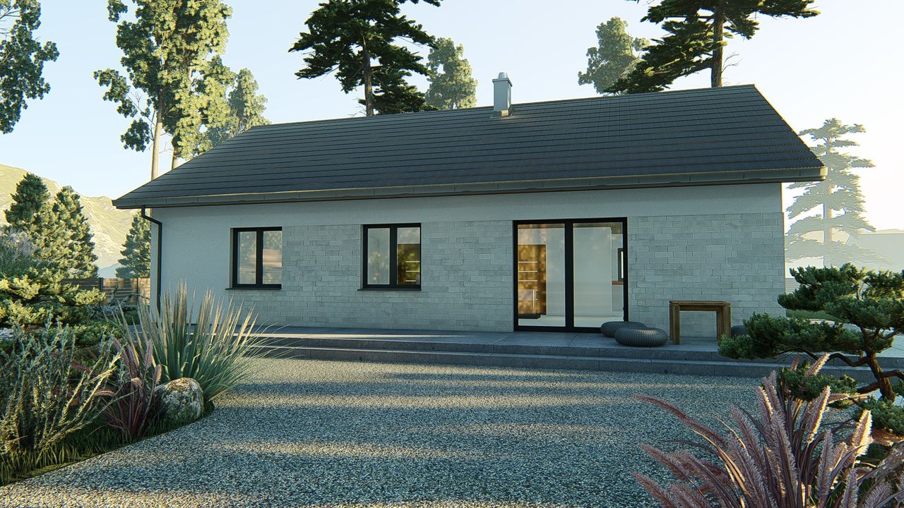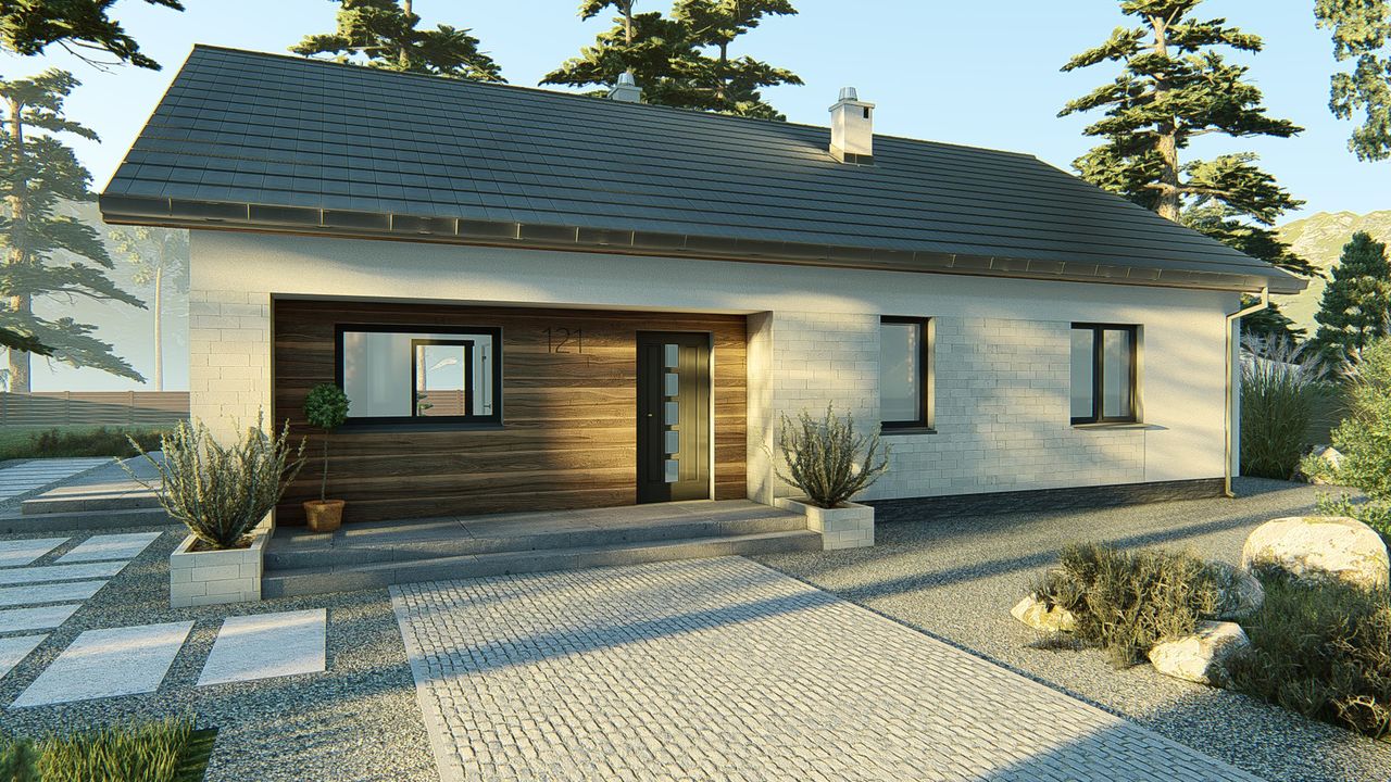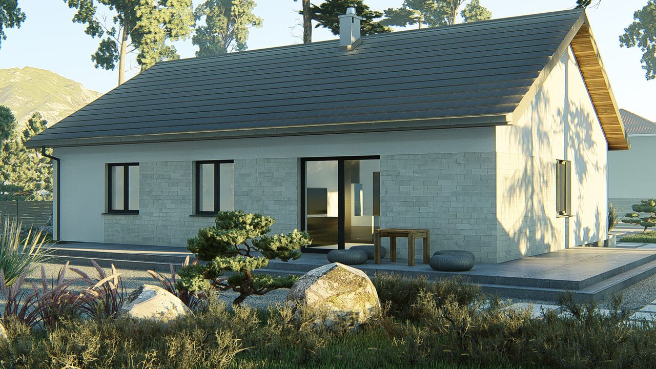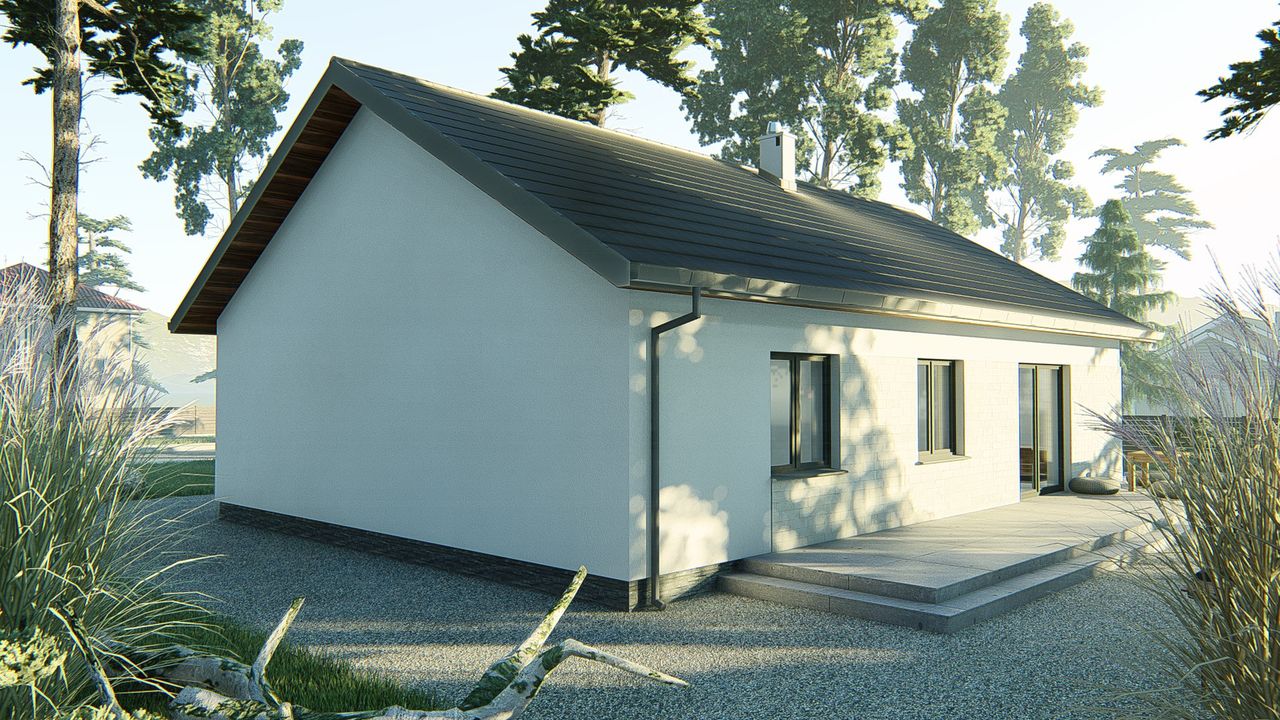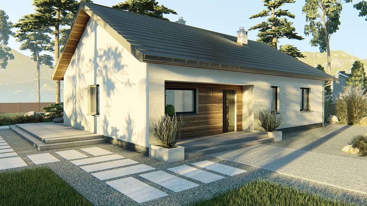 Graficzne opracowanie rzutów poglądowych widocznych na karcie projektu zostało wykonane przez Extradom.pl. Prezentowane przez Extradom.pl wizualizacje wykonane zostały przez autora projektu i należy poczytywać je jedynie za przykład i propozycję wykończenia, wizję architektoniczną autora projektu. Ostateczne wykończenie budynku może nastąpić na wiele sposobów. Szczegółowe rozwiązania zastosowane w oferowanej dokumentacji - w tym również ilość, lokalizacje i wygląd okien, drzwi, kominów - mogą w niewielkim stopniu różnić się od prezentowanej wizualizacji budynku.
