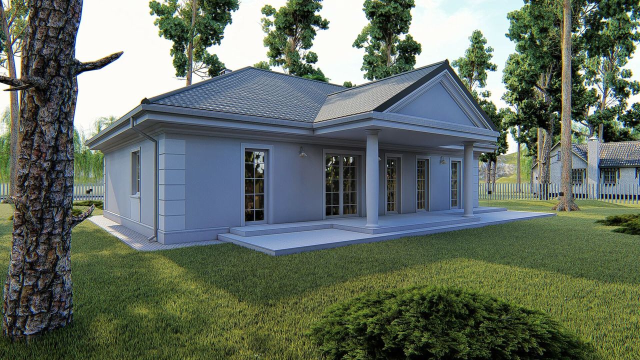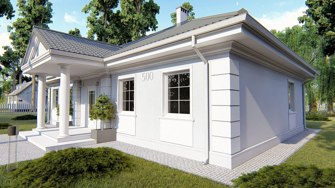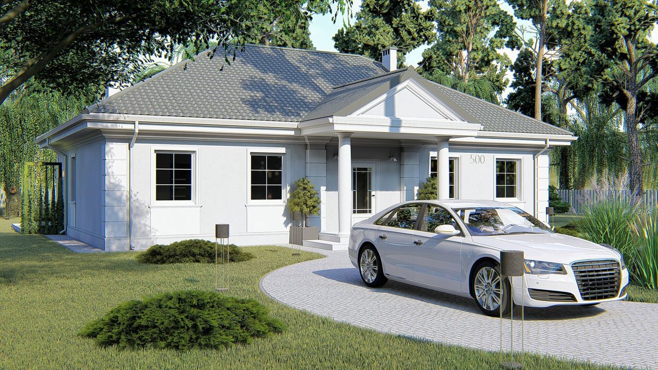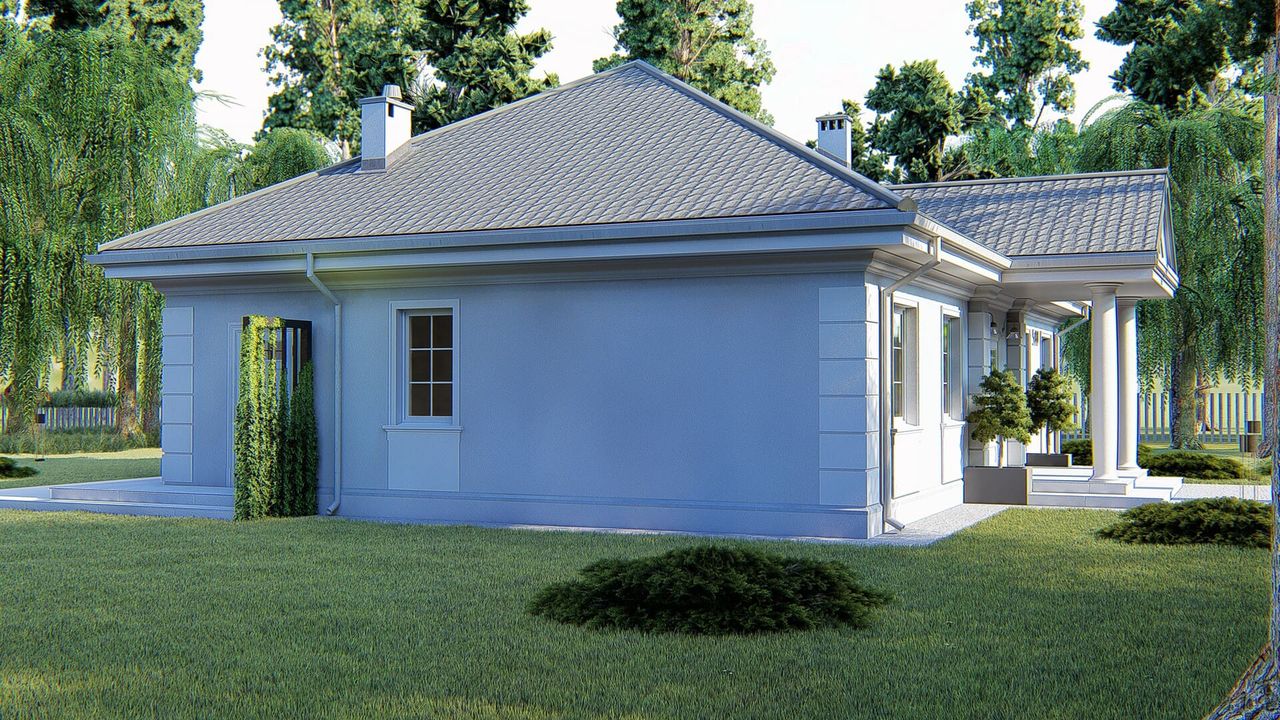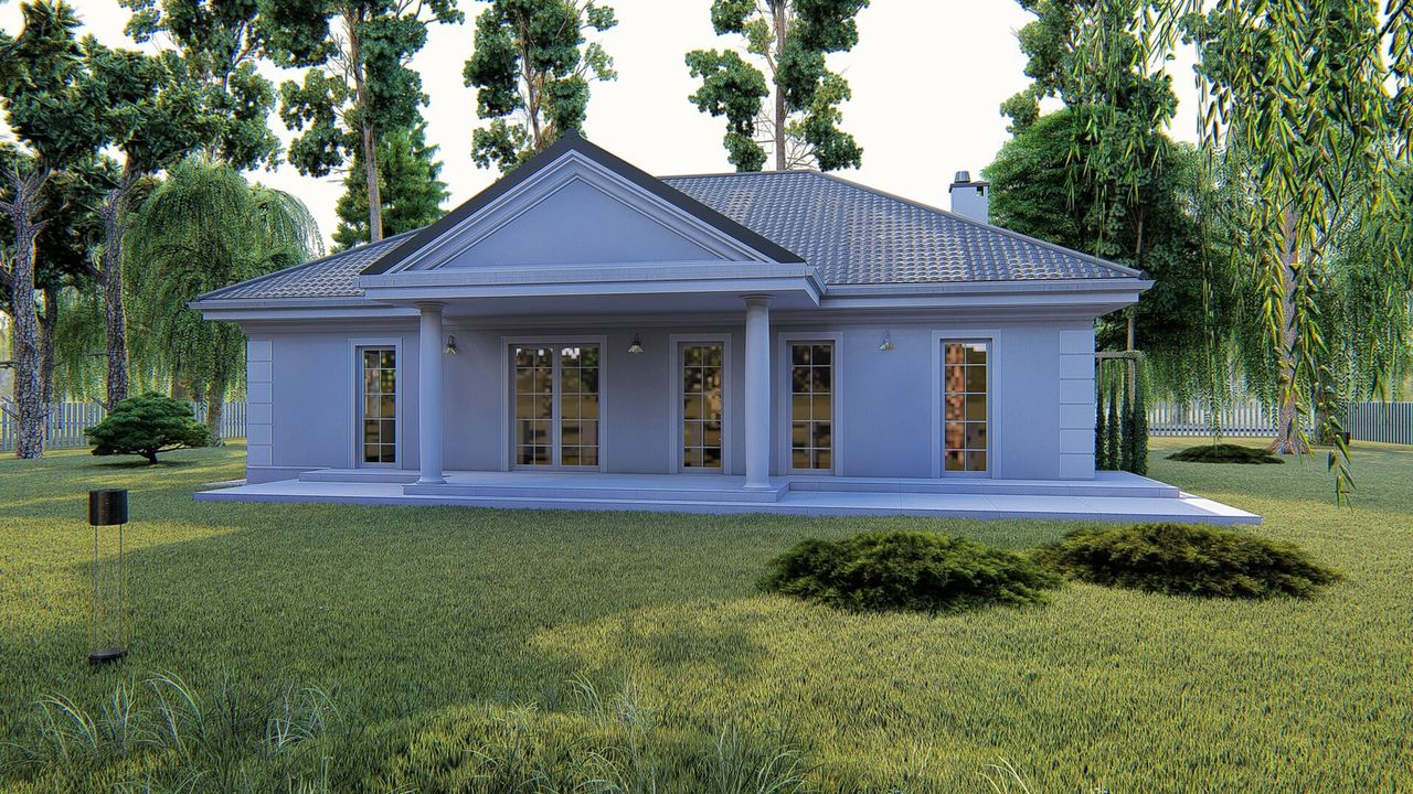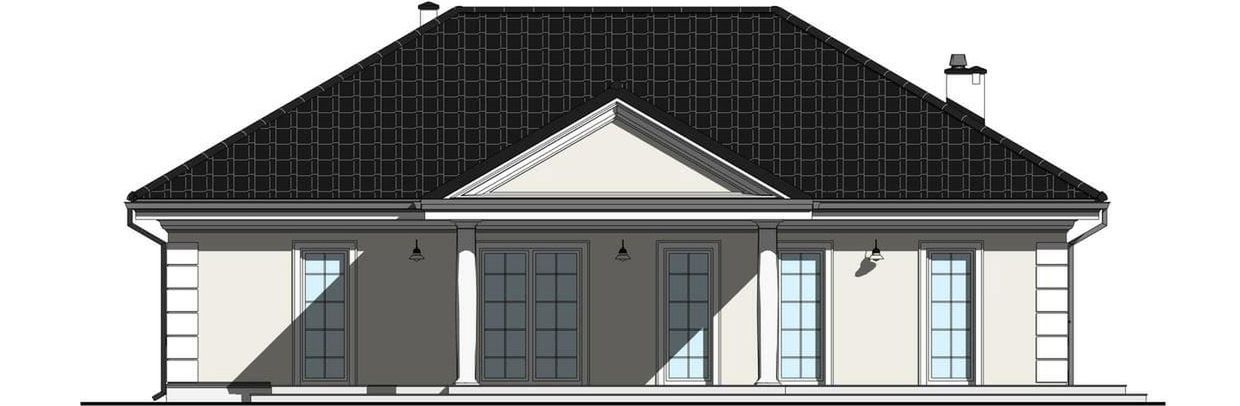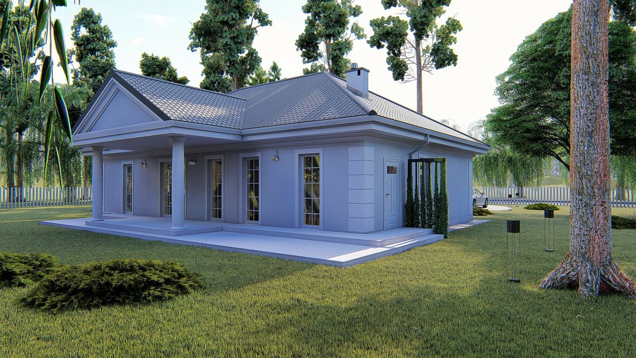 Graficzne opracowanie rzutów poglądowych widocznych na karcie projektu zostało wykonane przez Extradom.pl. Prezentowane przez Extradom.pl wizualizacje wykonane zostały przez autora projektu i należy poczytywać je jedynie za przykład i propozycję wykończenia, wizję architektoniczną autora projektu. Ostateczne wykończenie budynku może nastąpić na wiele sposobów. Szczegółowe rozwiązania zastosowane w oferowanej dokumentacji - w tym również ilość, lokalizacje i wygląd okien, drzwi, kominów - mogą w niewielkim stopniu różnić się od prezentowanej wizualizacji budynku.
