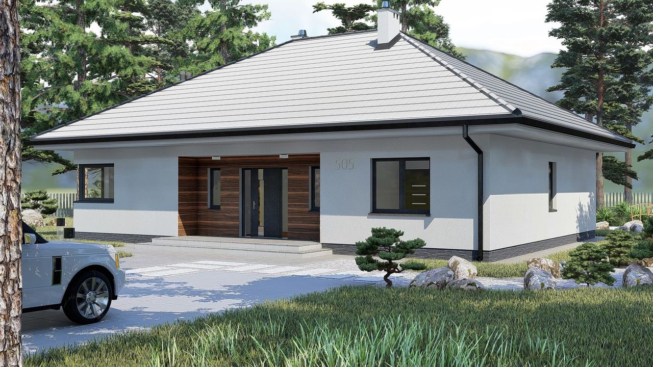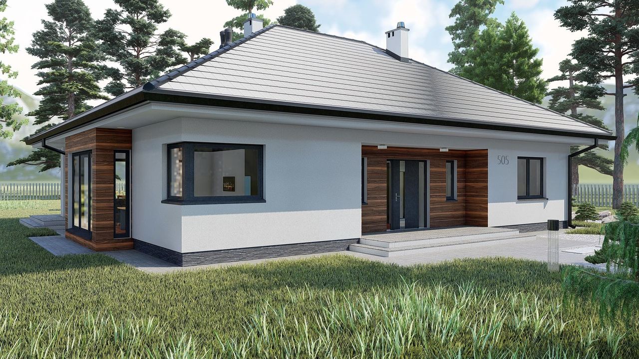 Graficzne opracowanie rzutów poglądowych widocznych na karcie projektu zostało wykonane przez Extradom.pl. Prezentowane przez Extradom.pl wizualizacje wykonane zostały przez autora projektu i należy poczytywać je jedynie za przykład i propozycję wykończenia, wizję architektoniczną autora projektu. Ostateczne wykończenie budynku może nastąpić na wiele sposobów. Szczegółowe rozwiązania zastosowane w oferowanej dokumentacji - w tym również ilość, lokalizacje i wygląd okien, drzwi, kominów - mogą w niewielkim stopniu różnić się od prezentowanej wizualizacji budynku.