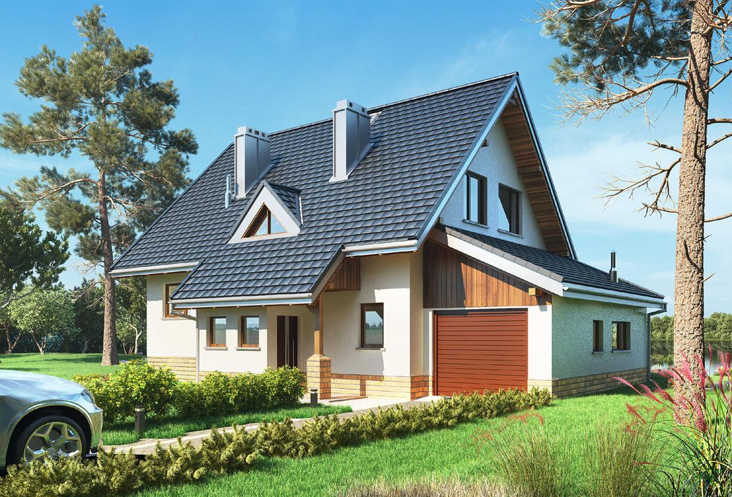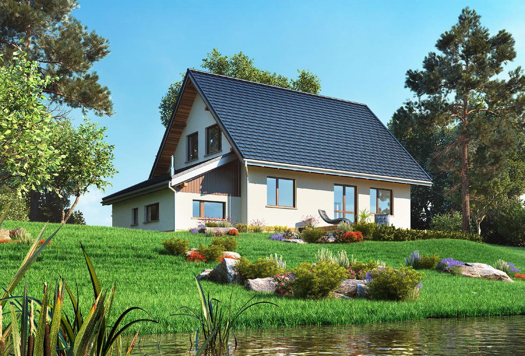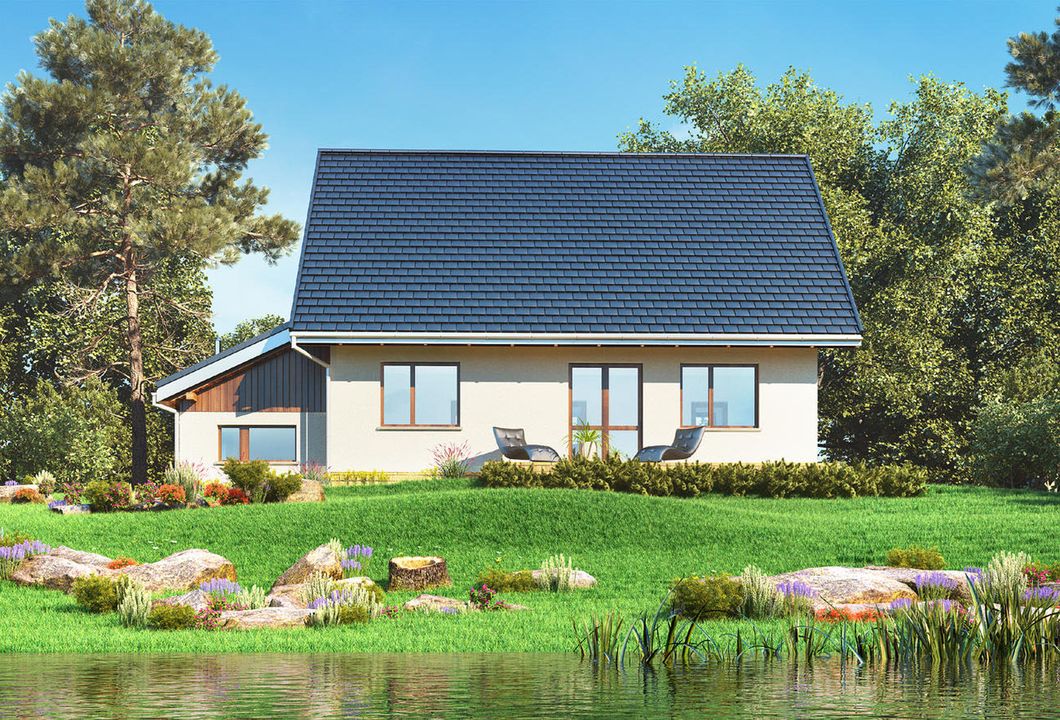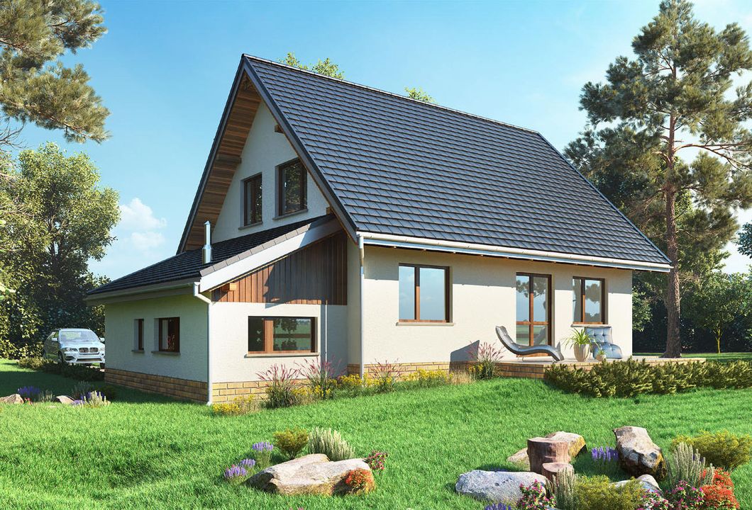 Graficzne opracowanie rzutów poglądowych widocznych na karcie projektu zostało wykonane przez Extradom.pl. Prezentowane przez Extradom.pl wizualizacje wykonane zostały przez autora projektu i należy poczytywać je jedynie za przykład i propozycję wykończenia, wizję architektoniczną autora projektu. Ostateczne wykończenie budynku może nastąpić na wiele sposobów. Szczegółowe rozwiązania zastosowane w oferowanej dokumentacji - w tym również ilość, lokalizacje i wygląd okien, drzwi, kominów - mogą w niewielkim stopniu różnić się od prezentowanej wizualizacji budynku.