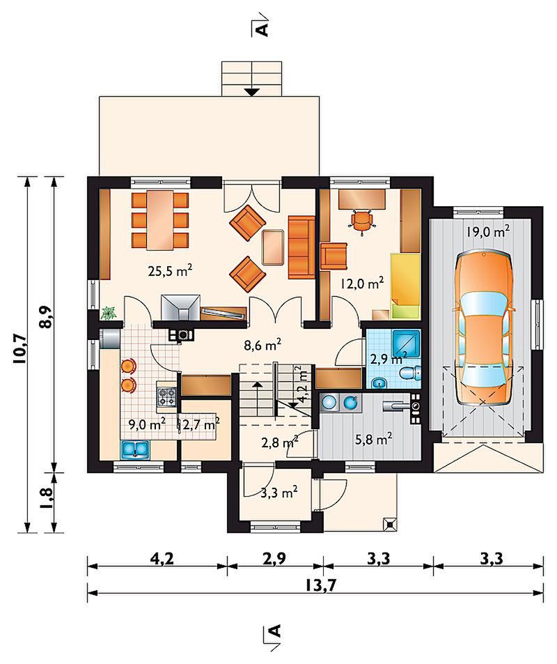Technologia i konstrukcja: murowana – beton komórkowy. Ściany zewnętrzne: beton komórkowy YTONG ENERGO gr.36,5cm. Ściany wewnętrzne: beton komórkowy YTONG ENERGO. Strop: żelbetowy. Konstrukcja dachu: jętkowa. Rodzaj schodów: żelbetowe. Typ ogrzewania: kocioł na gaz. Pokrycie dachu: dachówka firmy ROBEN. Elewacja: tynk cienkowarstwowy, silikonowy lub silikatowy.
