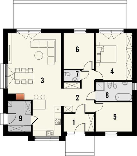 Graficzne opracowanie rzutów poglądowych widocznych na karcie projektu zostało wykonane przez Extradom.pl. Prezentowane przez Extradom.pl wizualizacje wykonane zostały przez autora projektu i należy poczytywać je jedynie za przykład i propozycję wykończenia, wizję architektoniczną autora projektu. Ostateczne wykończenie budynku może nastąpić na wiele sposobów. Szczegółowe rozwiązania zastosowane w oferowanej dokumentacji - w tym również ilość, lokalizacje i wygląd okien, drzwi, kominów - mogą w niewielkim stopniu różnić się od prezentowanej wizualizacji budynku.