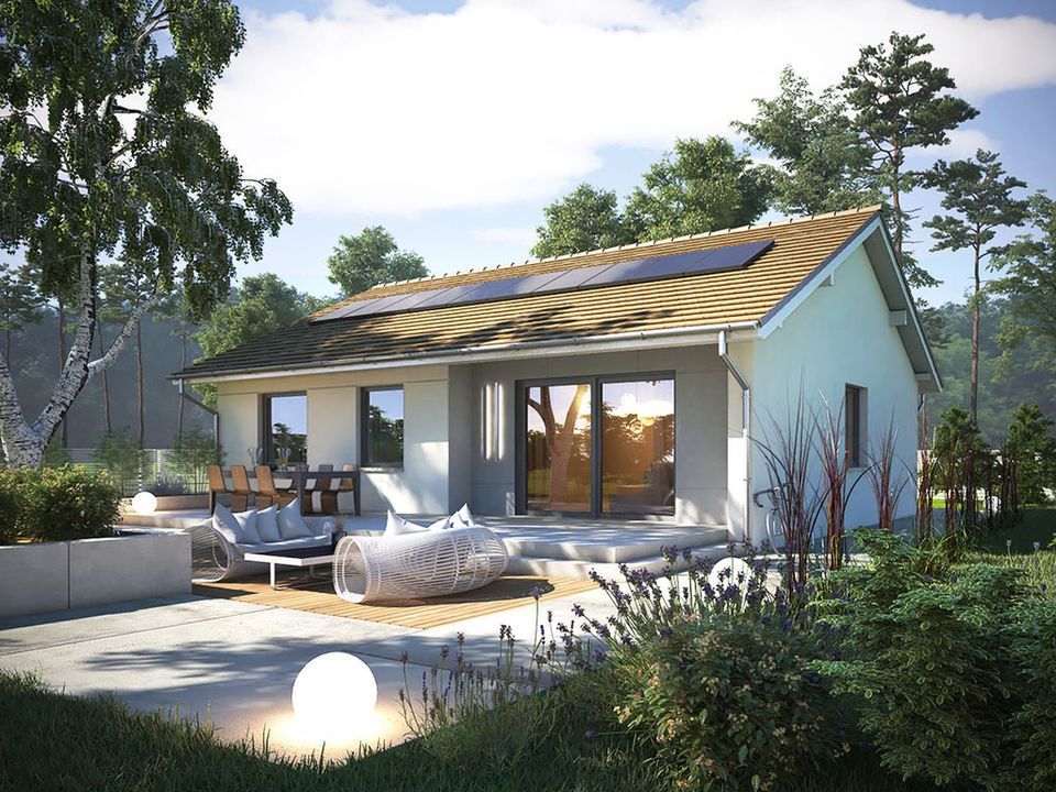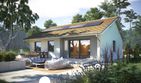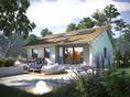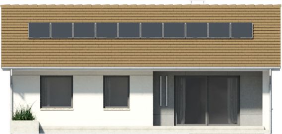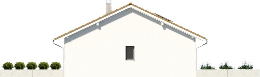 Projekt przewiduje postawienie ścian z bloczków gazobetonowych z warstwą styropianu od zewnątrz. W budynku zaprojektowano ocieplony wełną lekki sufit podwieszony do więźby dachowej, co jest na pewno ekonomicznym rozwiązaniem i typowym dla wszystkich naszych gotowych projektów domów parterowych bez stropu. Więźba wykonana jest z drewna, a jako pokrycie dachu może posłużyć dowolna dachówka ceramiczna lub betonowa. Elewacje wykończone są tynkiem strukturalnym na siatce. Materiały można zmieniać dowolnie już na etapie adaptacji.