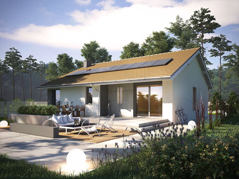 Projekt gotowy Krajobrazy 47 sugeruje budowę w technologii maurowanej, ze ścianami z bloczków gazobetonowych z dociepleniem płytami styropianowymi i otynkowanie elewacji tynkiem strukturalnym na siatce. Budynek nie ma masywnego stropu, tylko sufit z płyt G-K podwieszony do elementów drewnianej więźby i ocieplony wełną mineralną. Jako pokrycie zaproponowaliśmy dachówkę zakładkową, ceramiczną lub betonową. Dokumentacja dostępna jest w wersji standard oraz lustrzanej, a także w wariancie z ogrzewaniem gazowym i grzejnikami albo z pompą ciepła i z podłogówką.