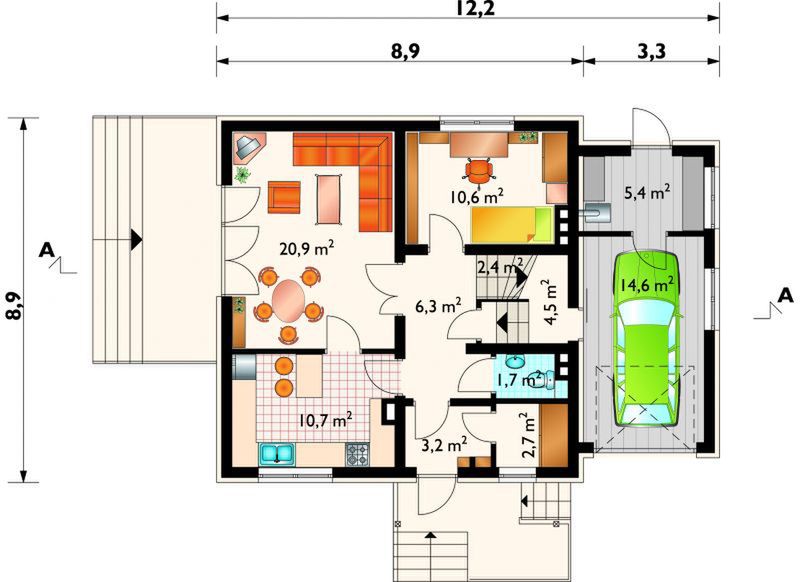 Technologia i konstrukcja: murowana – ceramika. Ściany zewnętrzne: cegła kratówka + styropian. Ściany wewnętrzne: cegła kratówka. Strop: żelbetowy. Konstrukcja dachu: drewniana, jętkowa. Rodzaj schodów: żelbetowe. Typ ogrzewania: kocioł na gaz. Aneks na paliwo stałe: na zamówienie. Pokrycie dachu: dachówka lub blachodachówka. Elewacja: tynk cienkowarstwowy.
