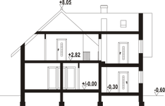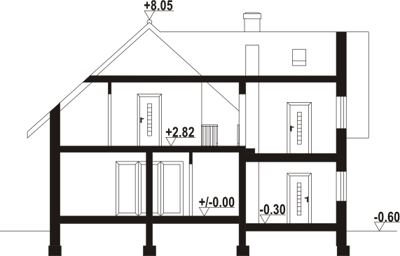 Wysokość ścianki kolankowej: 1.34 m. Strop: płyta żelbetowa. Pokrycie dachu: dachówka ceramiczna. Ściany zewnętrzne: pustaki ceramiczne + styropian. Ściany wewnętrzne: pustaki ceramiczne. Typ ogrzewania: kocioł gazowy.