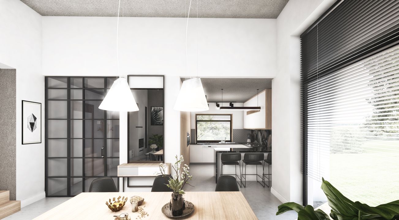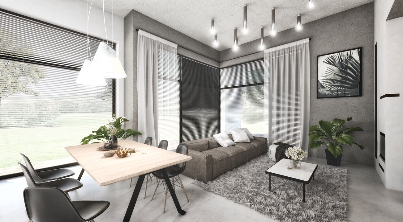 Graficzne opracowanie rzutów poglądowych widocznych na karcie projektu zostało wykonane przez Extradom.pl. Prezentowane przez Extradom.pl wizualizacje wykonane zostały przez autora projektu i należy poczytywać je jedynie za przykład i propozycję wykończenia, wizję architektoniczną autora projektu. Ostateczne wykończenie budynku może nastąpić na wiele sposobów. Szczegółowe rozwiązania zastosowane w oferowanej dokumentacji - w tym również ilość, lokalizacje i wygląd okien, drzwi, kominów - mogą w niewielkim stopniu różnić się od prezentowanej wizualizacji budynku.