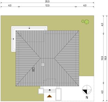 Graficzne opracowanie rzutów poglądowych widocznych na karcie projektu zostało wykonane przez Extradom.pl. Prezentowane przez Extradom.pl wizualizacje wykonane zostały przez autora projektu i należy poczytywać je jedynie za przykład i propozycję wykończenia, wizję architektoniczną autora projektu. Ostateczne wykończenie budynku może nastąpić na wiele sposobów. Szczegółowe rozwiązania zastosowane w oferowanej dokumentacji - w tym również ilość, lokalizacje i wygląd okien, drzwi, kominów - mogą w niewielkim stopniu różnić się od prezentowanej wizualizacji budynku.