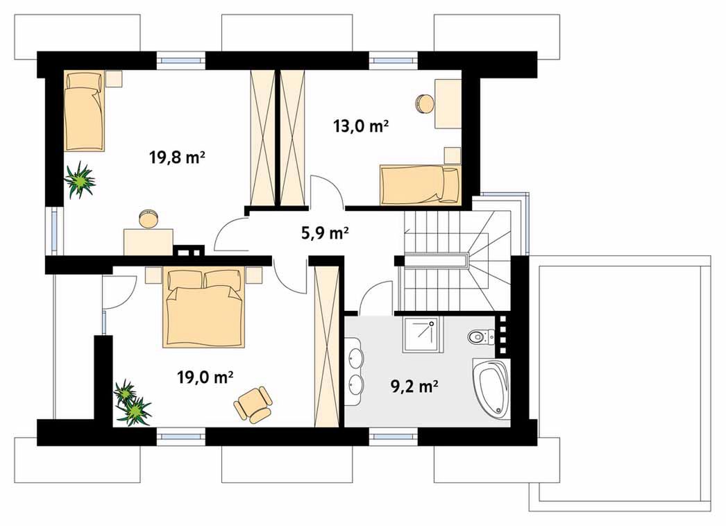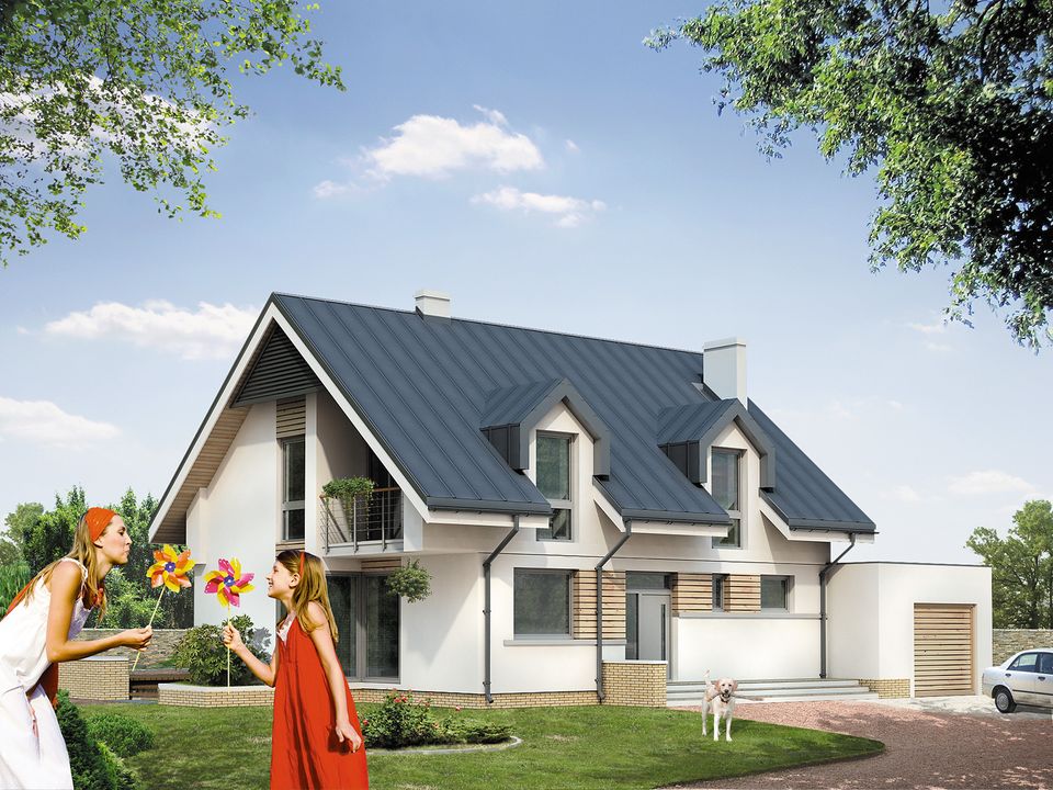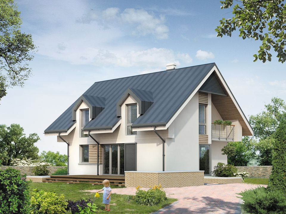 Graficzne opracowanie rzutów poglądowych widocznych na karcie projektu zostało wykonane przez Extradom.pl. Prezentowane przez Extradom.pl wizualizacje wykonane zostały przez autora projektu i należy poczytywać je jedynie za przykład i propozycję wykończenia, wizję architektoniczną autora projektu. Ostateczne wykończenie budynku może nastąpić na wiele sposobów. Szczegółowe rozwiązania zastosowane w oferowanej dokumentacji - w tym również ilość, lokalizacje i wygląd okien, drzwi, kominów - mogą w niewielkim stopniu różnić się od prezentowanej wizualizacji budynku.
