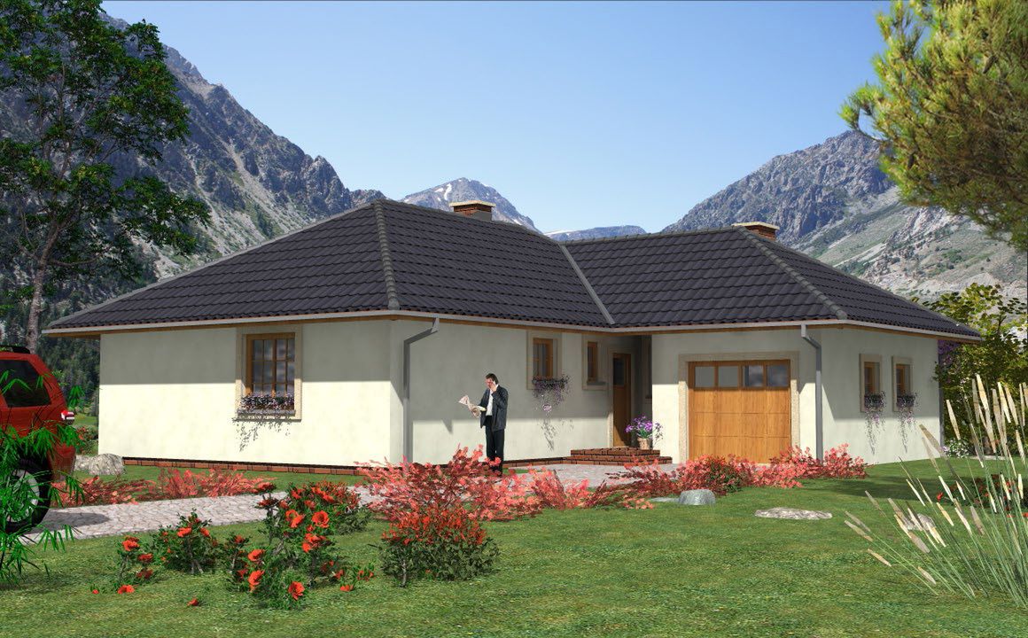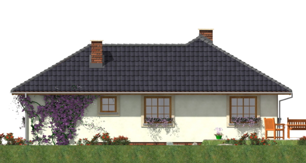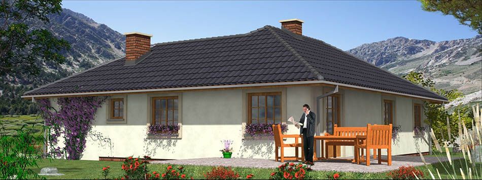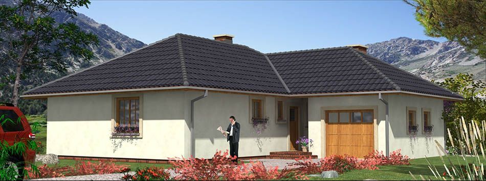 Graficzne opracowanie rzutów poglądowych widocznych na karcie projektu zostało wykonane przez Extradom.pl. Prezentowane przez Extradom.pl wizualizacje wykonane zostały przez autora projektu i należy poczytywać je jedynie za przykład i propozycję wykończenia, wizję architektoniczną autora projektu. Ostateczne wykończenie budynku może nastąpić na wiele sposobów. Szczegółowe rozwiązania zastosowane w oferowanej dokumentacji - w tym również ilość, lokalizacje i wygląd okien, drzwi, kominów - mogą w niewielkim stopniu różnić się od prezentowanej wizualizacji budynku.