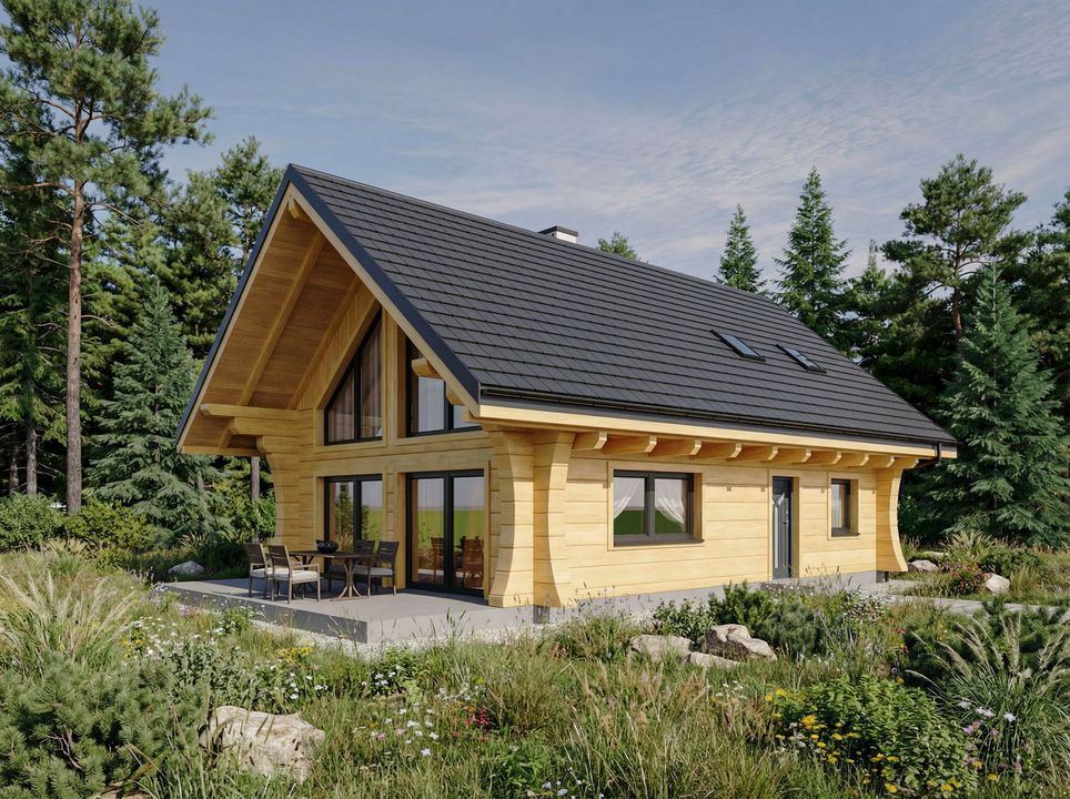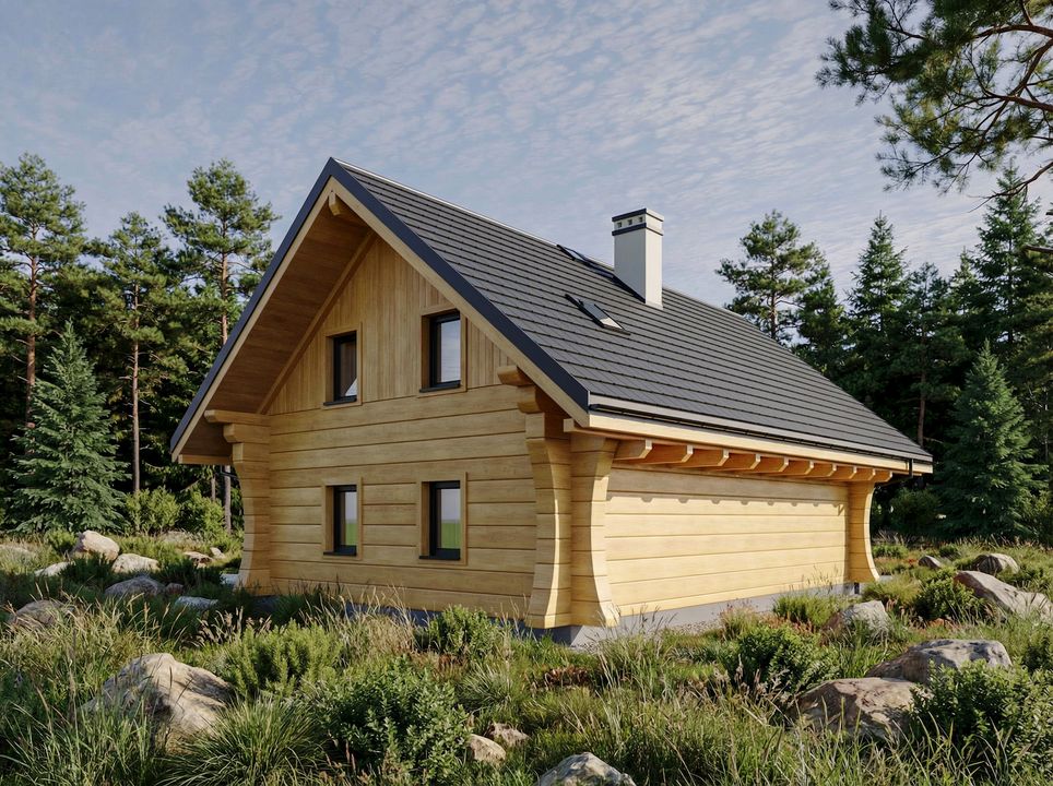 Ściany zewnętrzne parteru: z bala drewnianego grubości 35 cm z odpowiednią warstwą ocieplenia; Ściany wewnętrzne: Ściany wewnętrzne parteru – ściany w konstrukcji szkieletowej gr. 16 cm wypełnione wełną mineralną. Ściany wewnętrzne poddasza – ścianki w konstrukcji szkieletowej gr. 12 cm wypełnione wełną mineralną. Pokrycie dachu: dachówka; Konstrukcja dachu: krokwiowo-płatwiowa; fundamenty: ławy fundamentowe; Strop nad parterem: drewniany widoczny