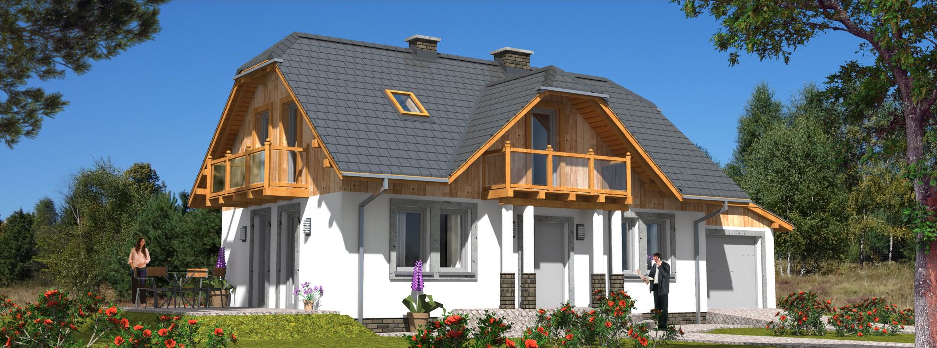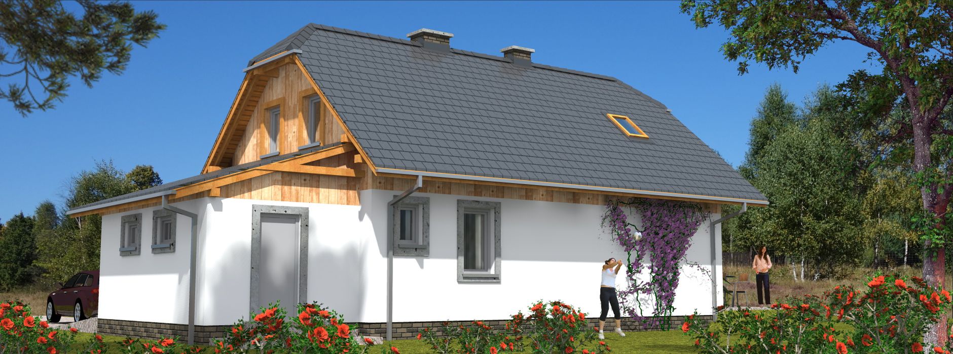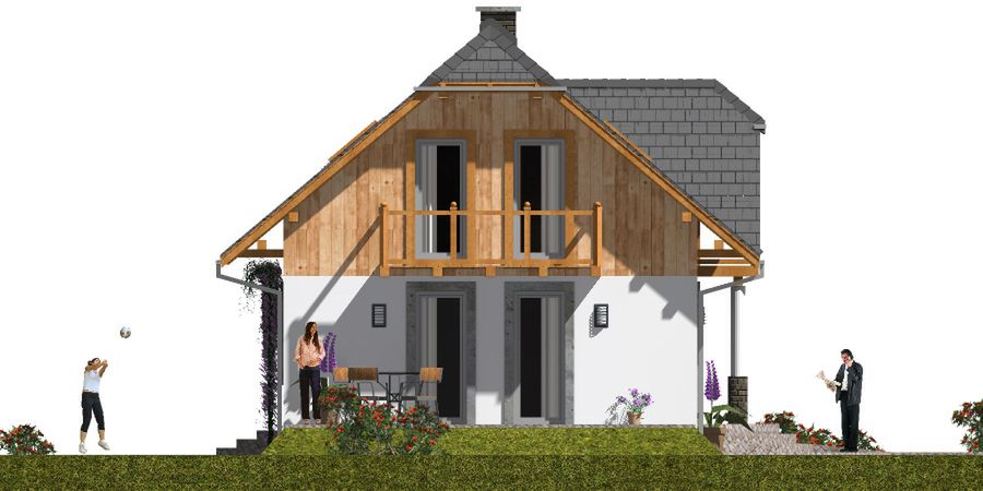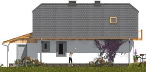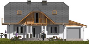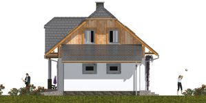 Graficzne opracowanie rzutów poglądowych widocznych na karcie projektu zostało wykonane przez Extradom.pl. Prezentowane przez Extradom.pl wizualizacje wykonane zostały przez autora projektu i należy poczytywać je jedynie za przykład i propozycję wykończenia, wizję architektoniczną autora projektu. Ostateczne wykończenie budynku może nastąpić na wiele sposobów. Szczegółowe rozwiązania zastosowane w oferowanej dokumentacji - w tym również ilość, lokalizacje i wygląd okien, drzwi, kominów - mogą w niewielkim stopniu różnić się od prezentowanej wizualizacji budynku.