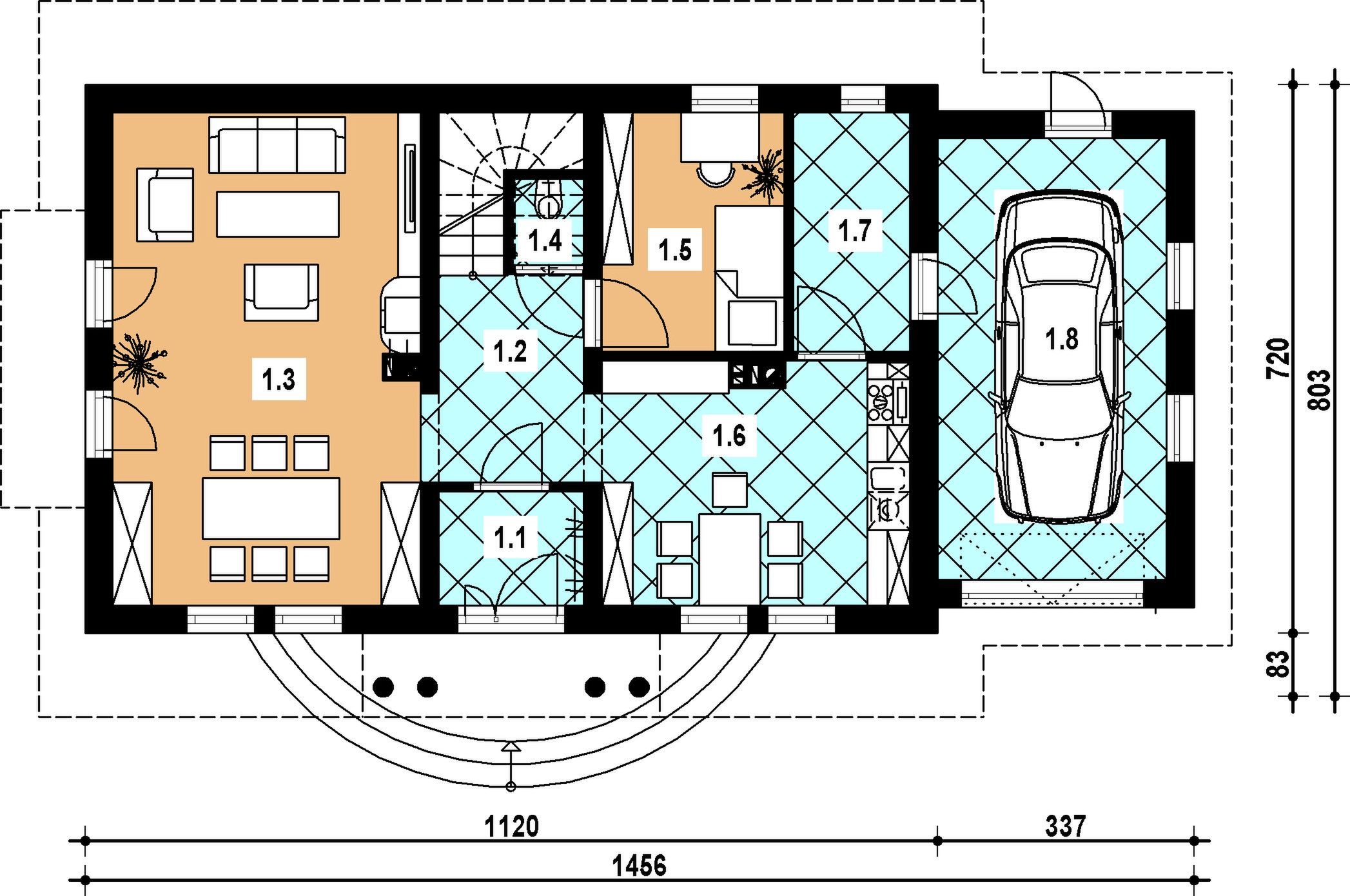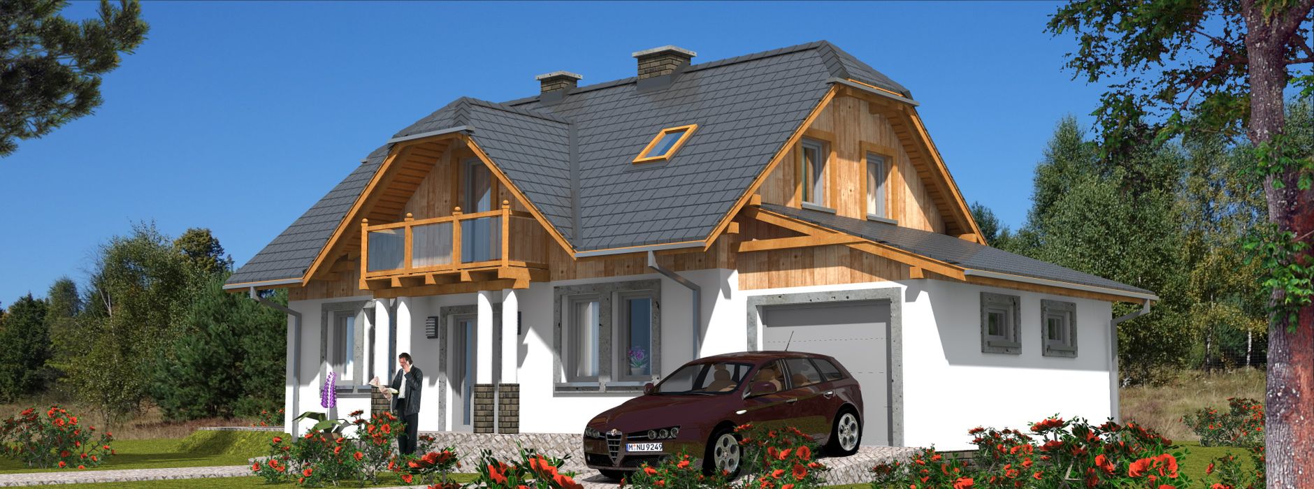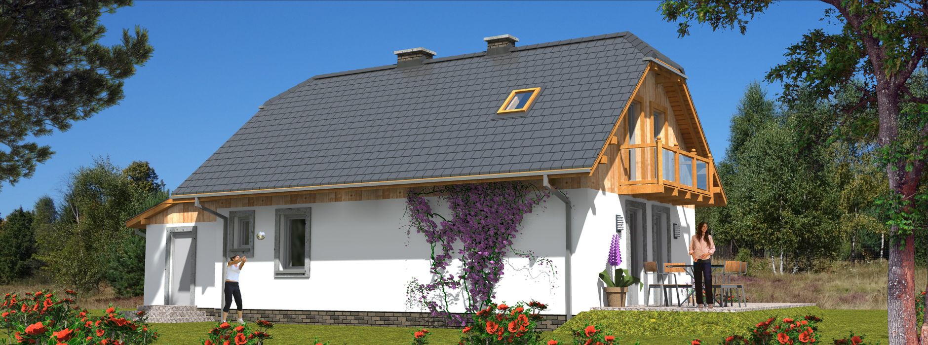 Graficzne opracowanie rzutów poglądowych widocznych na karcie projektu zostało wykonane przez Extradom.pl. Prezentowane przez Extradom.pl wizualizacje wykonane zostały przez autora projektu i należy poczytywać je jedynie za przykład i propozycję wykończenia, wizję architektoniczną autora projektu. Ostateczne wykończenie budynku może nastąpić na wiele sposobów. Szczegółowe rozwiązania zastosowane w oferowanej dokumentacji - w tym również ilość, lokalizacje i wygląd okien, drzwi, kominów - mogą w niewielkim stopniu różnić się od prezentowanej wizualizacji budynku.