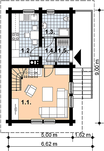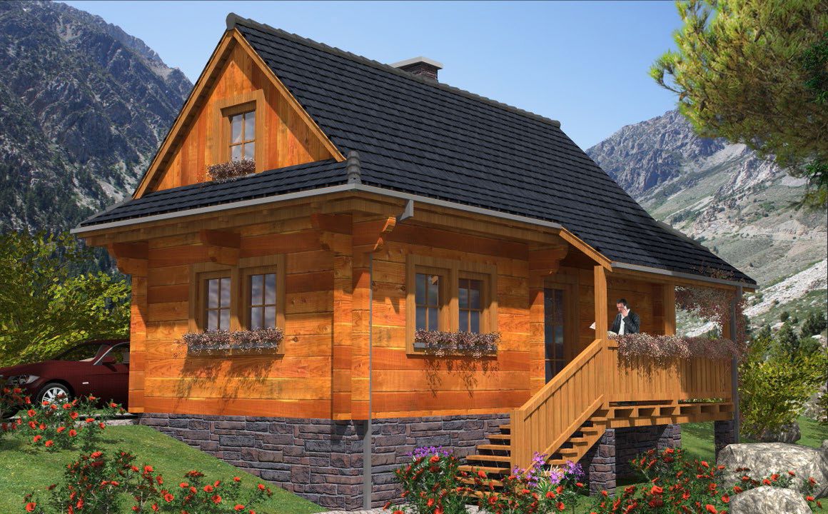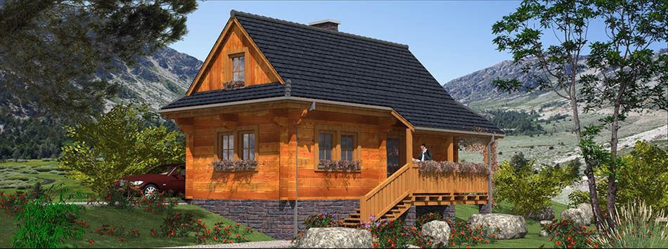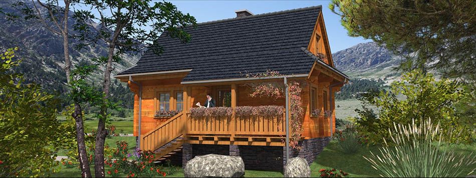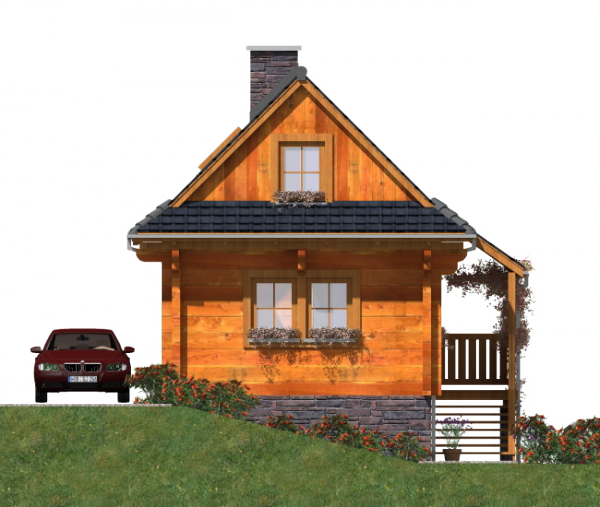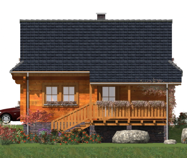 Fundamenty: żelbetowe, wylewane. Ściany zewnętrzne: z bali drewnianych gr. 16 plus ocieplenie z wełny mineralnej. Projekt dopuszcza ściany grubości 12, 20, 24, 30 cm ocieplone od wewnątrz wełną mineralną oraz gr. 62 cm bez ocieplenia. Strop: belkowy, drewniany, otwarty. Schody: drewniane. Pokrycie dachu: gont bitumiczny. Nachylenie dachu: 45°. Sposób ogrzewania: piec dwufunkcyjny na gaz ziemny lub płynny.