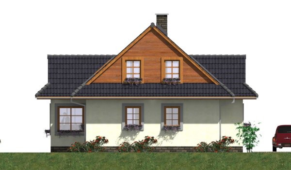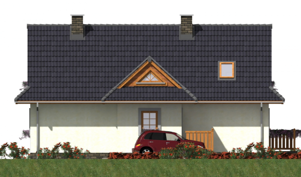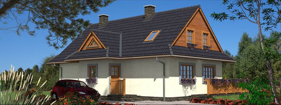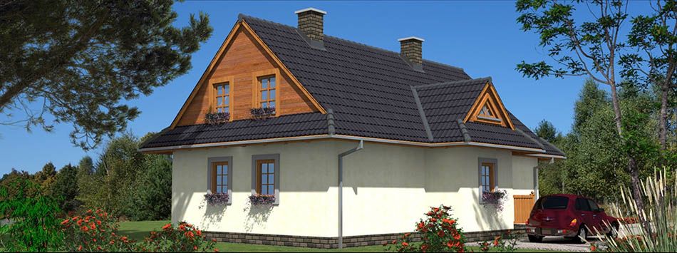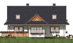 Graficzne opracowanie rzutów poglądowych widocznych na karcie projektu zostało wykonane przez Extradom.pl. Prezentowane przez Extradom.pl wizualizacje wykonane zostały przez autora projektu i należy poczytywać je jedynie za przykład i propozycję wykończenia, wizję architektoniczną autora projektu. Ostateczne wykończenie budynku może nastąpić na wiele sposobów. Szczegółowe rozwiązania zastosowane w oferowanej dokumentacji - w tym również ilość, lokalizacje i wygląd okien, drzwi, kominów - mogą w niewielkim stopniu różnić się od prezentowanej wizualizacji budynku.