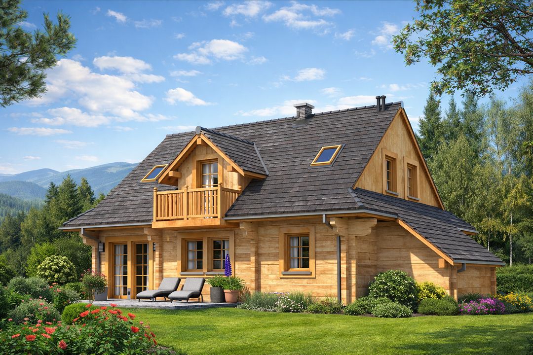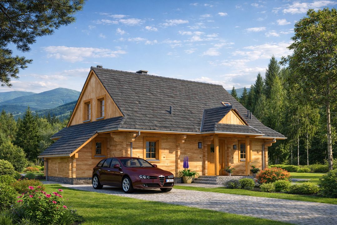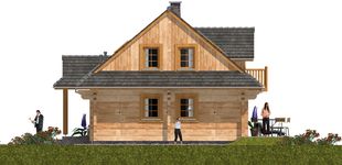 Fundamenty: żelbetowe, wylewane. Ściany zewnętrzne: z bali drewnianych gr. 16 plus ocieplenie 12 cm. Projekt dopuszcza ściany grubości 12, 20, 24, 30 cm ocieplone od wewnątrz wełną mineralną oraz gr. 62 cm bez ocieplenia. Schody: drewniane. Strop: belkowy, drewniany, otwarty. Dach: dwuspadowy. Pokrycie dachu: gont bitumiczny. Nachylenie dachu: 40°. Sposób ogrzewania: Piec dwufunkcyjny na gaz ziemny lub płynny. Istnieje możliwość zastosowania pieca na paliwo stałe. Takie rozwiązanie inwestor może zastosować dokonując zmiany na etapie adaptacji lub w trakcie użytkowania budynku.