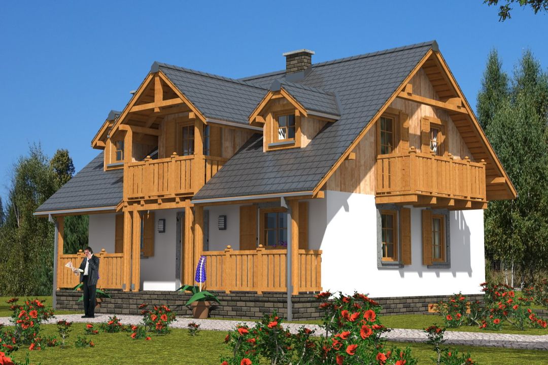 Graficzne opracowanie rzutów poglądowych widocznych na karcie projektu zostało wykonane przez Extradom.pl. Prezentowane przez Extradom.pl wizualizacje wykonane zostały przez autora projektu i należy poczytywać je jedynie za przykład i propozycję wykończenia, wizję architektoniczną autora projektu. Ostateczne wykończenie budynku może nastąpić na wiele sposobów. Szczegółowe rozwiązania zastosowane w oferowanej dokumentacji - w tym również ilość, lokalizacje i wygląd okien, drzwi, kominów - mogą w niewielkim stopniu różnić się od prezentowanej wizualizacji budynku.