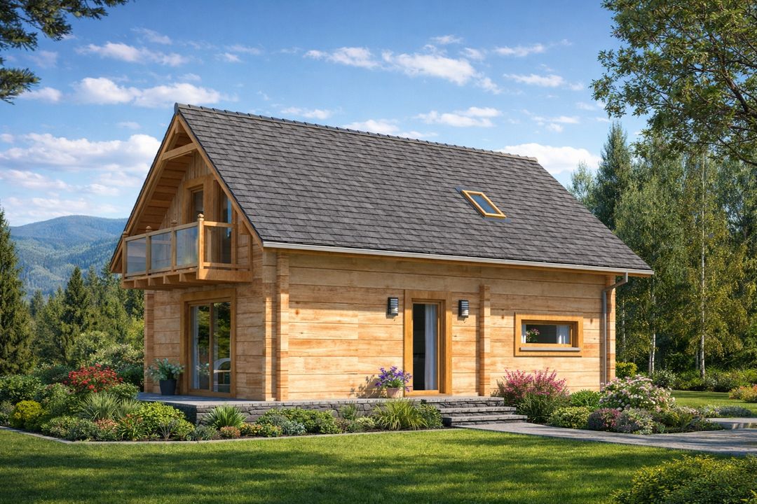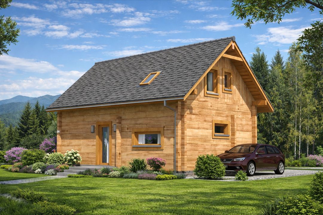 Fundamenty: żelbetowe, wylewane. Ściany zewnętrzne: z bali drewnianych gr. 16 plus ocieplenie. Projekt dopuszcza ściany grubości 12, 20, 24, 30 cm ocieplone od wewnątrz wełną mineralną oraz gr. 62 cm bez ocieplenia. Schody: drewniane. Strop: belkowy, drewniany, otwarty. Dach: dwuspadowy. Pokrycie dachu: gont bitumiczny. Nachylenie dachu: 40°. Sposób ogrzewania: piec dwufunkcyjny na gaz ziemny lub płynny.