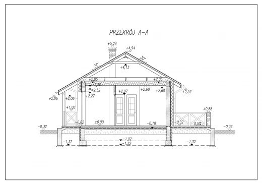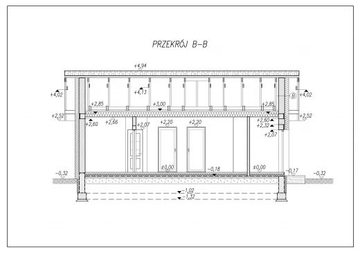 Budynek o zwartej bryle, parterowy, przekryty dachem dwuspadowym. Maksymalna wysokość budynku wynosi 5,26m. Nowoprojektowany budynek swoją formą nawiązywać winien do zabudowy występującej w sąsiedztwie planowanej inwestycji. KONSTRUKCJA:Główne rozwiązania konstrukcyjno-materiałowe:Projektowany budynek zaprojektowano w technologii murowanej. Główną konstrukcję nośną stanowić będą: ławy betonowe i ściąg zazbrojone konstrukcyjnie, ściany nośne w układzie mieszanym spięte wieńcem opaskowym, dach wielospadowy, oparty na więźbie o konstrukcji drewnianej krokwiowo-jętkowej z drewna klasy C-30 o wilgotności <22% .
