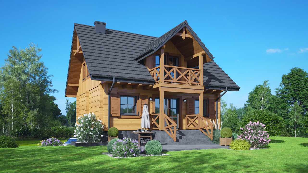 Wysokość ścianki kolankowej: 0.91 m. Strop: drewniany. Pokrycie dachu: dachówka gontopodobna Gerard Corona. Ściany zewnętrzne: płazy drewniane + wełna mineralna + deska. Ściany wewnętrzne: płazy drewniane. Typ ogrzewania: kocioł gazowy. Inne: brama garażowa i drzwi Hörmann.