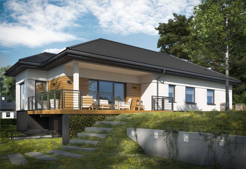 Graficzne opracowanie rzutów poglądowych widocznych na karcie projektu zostało wykonane przez Extradom.pl. Prezentowane przez Extradom.pl wizualizacje wykonane zostały przez autora projektu i należy poczytywać je jedynie za przykład i propozycję wykończenia, wizję architektoniczną autora projektu. Ostateczne wykończenie budynku może nastąpić na wiele sposobów. Szczegółowe rozwiązania zastosowane w oferowanej dokumentacji - w tym również ilość, lokalizacje i wygląd okien, drzwi, kominów - mogą w niewielkim stopniu różnić się od prezentowanej wizualizacji budynku.