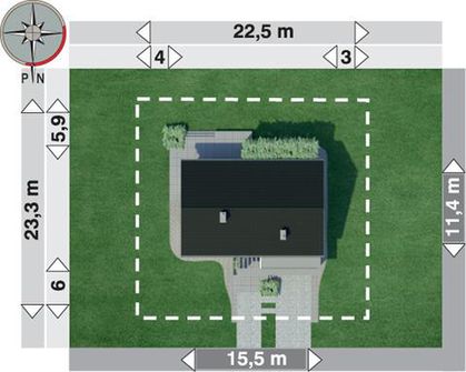 Graficzne opracowanie rzutów poglądowych widocznych na karcie projektu zostało wykonane przez Extradom.pl. Prezentowane przez Extradom.pl wizualizacje wykonane zostały przez autora projektu i należy poczytywać je jedynie za przykład i propozycję wykończenia, wizję architektoniczną autora projektu. Ostateczne wykończenie budynku może nastąpić na wiele sposobów. Szczegółowe rozwiązania zastosowane w oferowanej dokumentacji - w tym również ilość, lokalizacje i wygląd okien, drzwi, kominów - mogą w niewielkim stopniu różnić się od prezentowanej wizualizacji budynku.