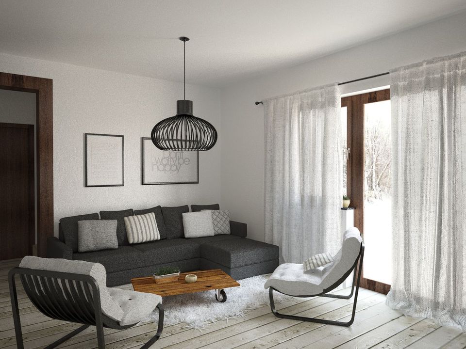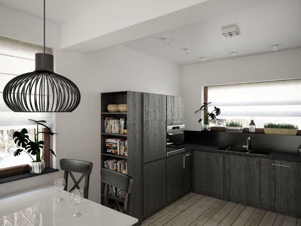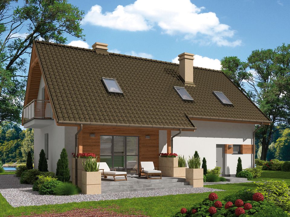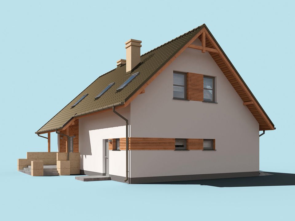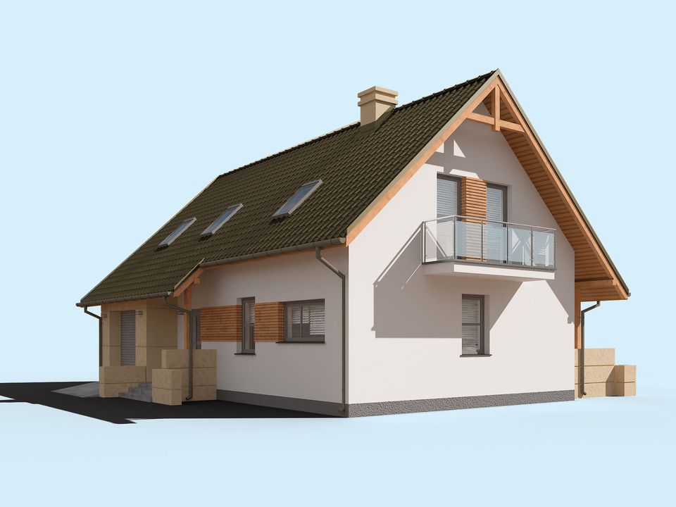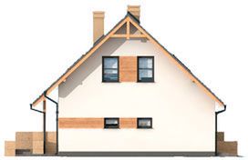Graficzne opracowanie rzutów poglądowych widocznych na karcie projektu zostało wykonane przez Extradom.pl. Prezentowane przez Extradom.pl wizualizacje wykonane zostały przez autora projektu i należy poczytywać je jedynie za przykład i propozycję wykończenia, wizję architektoniczną autora projektu. Ostateczne wykończenie budynku może nastąpić na wiele sposobów. Szczegółowe rozwiązania zastosowane w oferowanej dokumentacji - w tym również ilość, lokalizacje i wygląd okien, drzwi, kominów - mogą w niewielkim stopniu różnić się od prezentowanej wizualizacji budynku.
