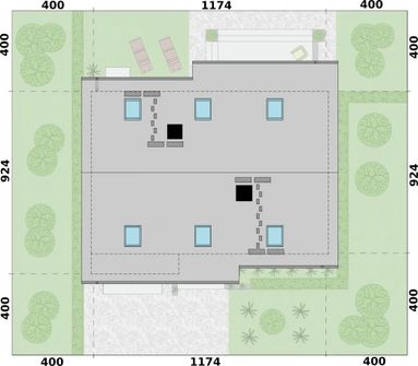Graficzne opracowanie rzutów poglądowych widocznych na karcie projektu zostało wykonane przez Extradom.pl. Prezentowane przez Extradom.pl wizualizacje wykonane zostały przez autora projektu i należy poczytywać je jedynie za przykład i propozycję wykończenia, wizję architektoniczną autora projektu. Ostateczne wykończenie budynku może nastąpić na wiele sposobów. Szczegółowe rozwiązania zastosowane w oferowanej dokumentacji - w tym również ilość, lokalizacje i wygląd okien, drzwi, kominów - mogą w niewielkim stopniu różnić się od prezentowanej wizualizacji budynku.