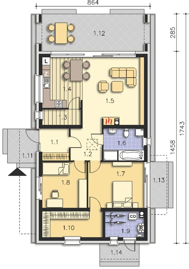 Graficzne opracowanie rzutów poglądowych widocznych na karcie projektu zostało wykonane przez Extradom.pl. Prezentowane przez Extradom.pl wizualizacje wykonane zostały przez autora projektu i należy poczytywać je jedynie za przykład i propozycję wykończenia, wizję architektoniczną autora projektu. Ostateczne wykończenie budynku może nastąpić na wiele sposobów. Szczegółowe rozwiązania zastosowane w oferowanej dokumentacji - w tym również ilość, lokalizacje i wygląd okien, drzwi, kominów - mogą w niewielkim stopniu różnić się od prezentowanej wizualizacji budynku.