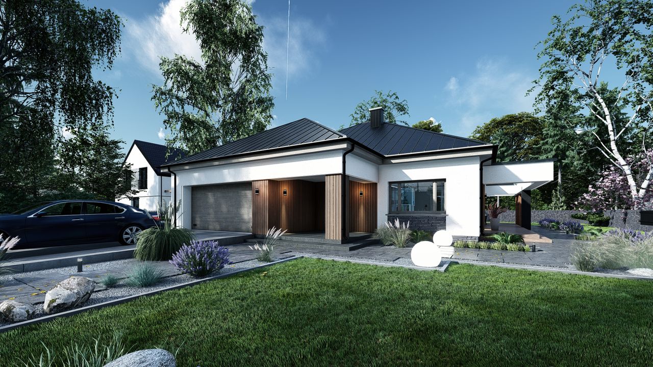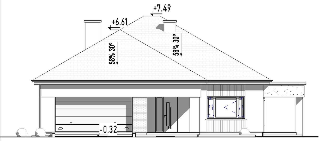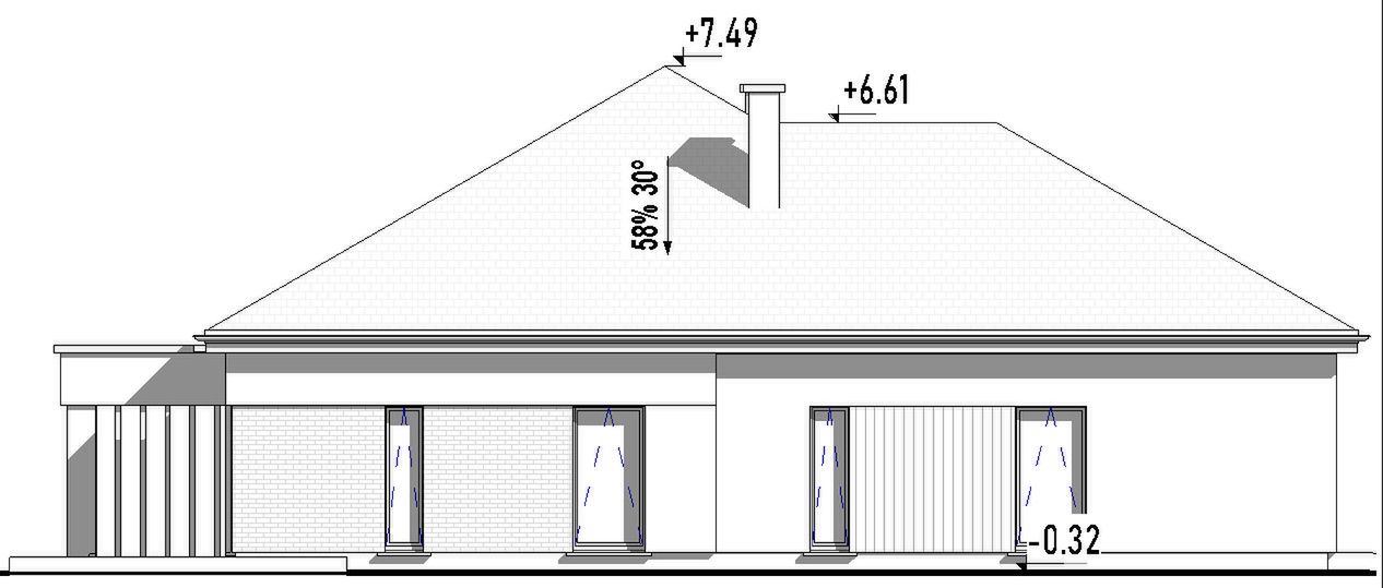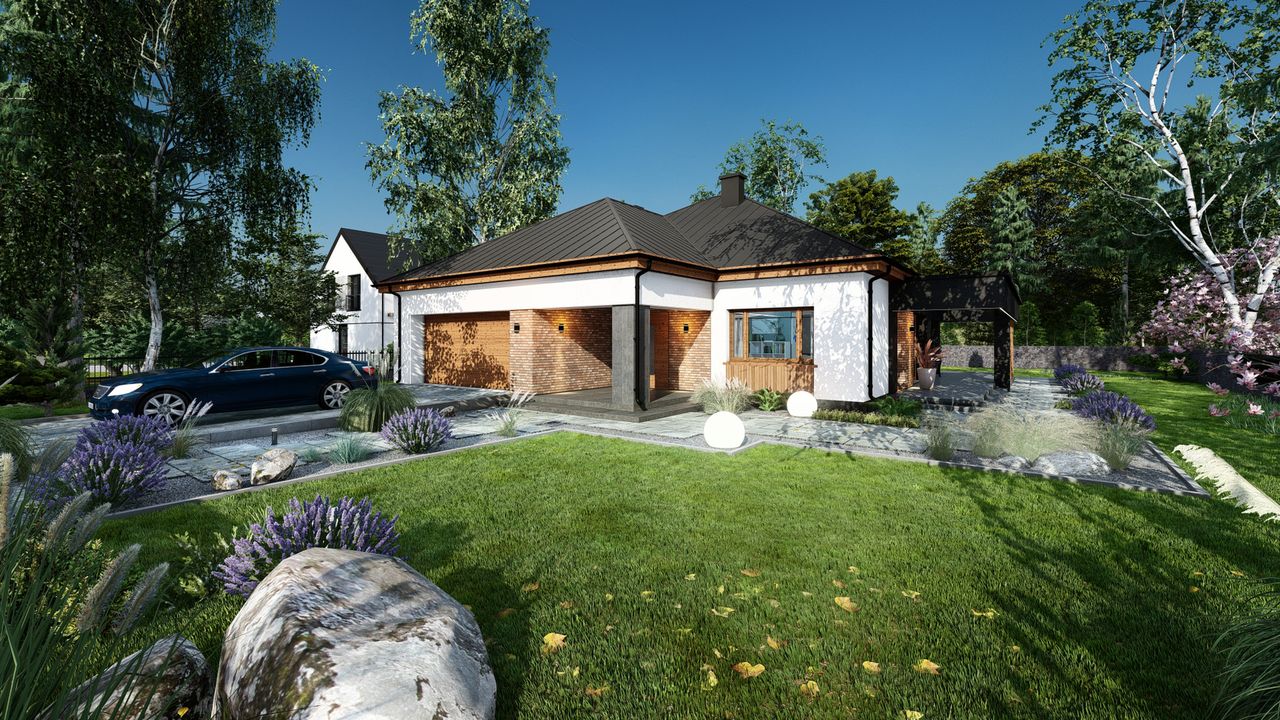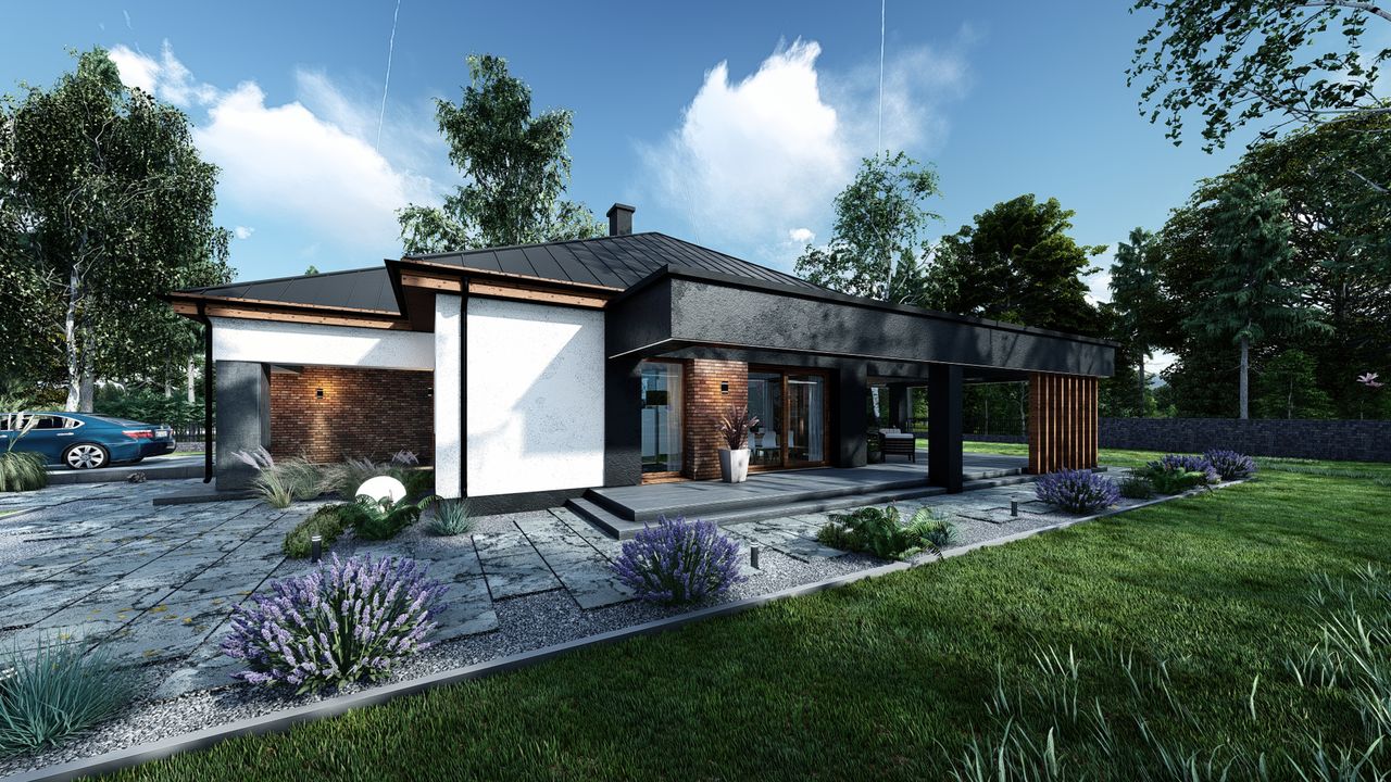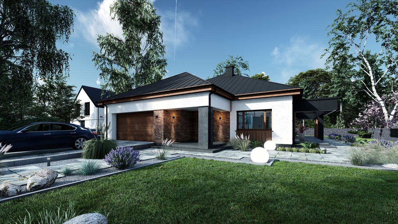 Graficzne opracowanie rzutów poglądowych widocznych na karcie projektu zostało wykonane przez Extradom.pl. Prezentowane przez Extradom.pl wizualizacje wykonane zostały przez autora projektu i należy poczytywać je jedynie za przykład i propozycję wykończenia, wizję architektoniczną autora projektu. Ostateczne wykończenie budynku może nastąpić na wiele sposobów. Szczegółowe rozwiązania zastosowane w oferowanej dokumentacji - w tym również ilość, lokalizacje i wygląd okien, drzwi, kominów - mogą w niewielkim stopniu różnić się od prezentowanej wizualizacji budynku.