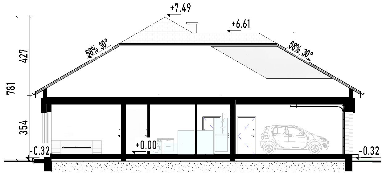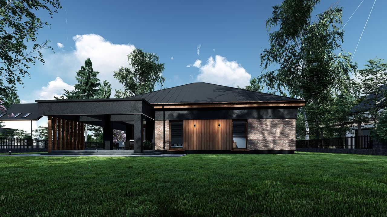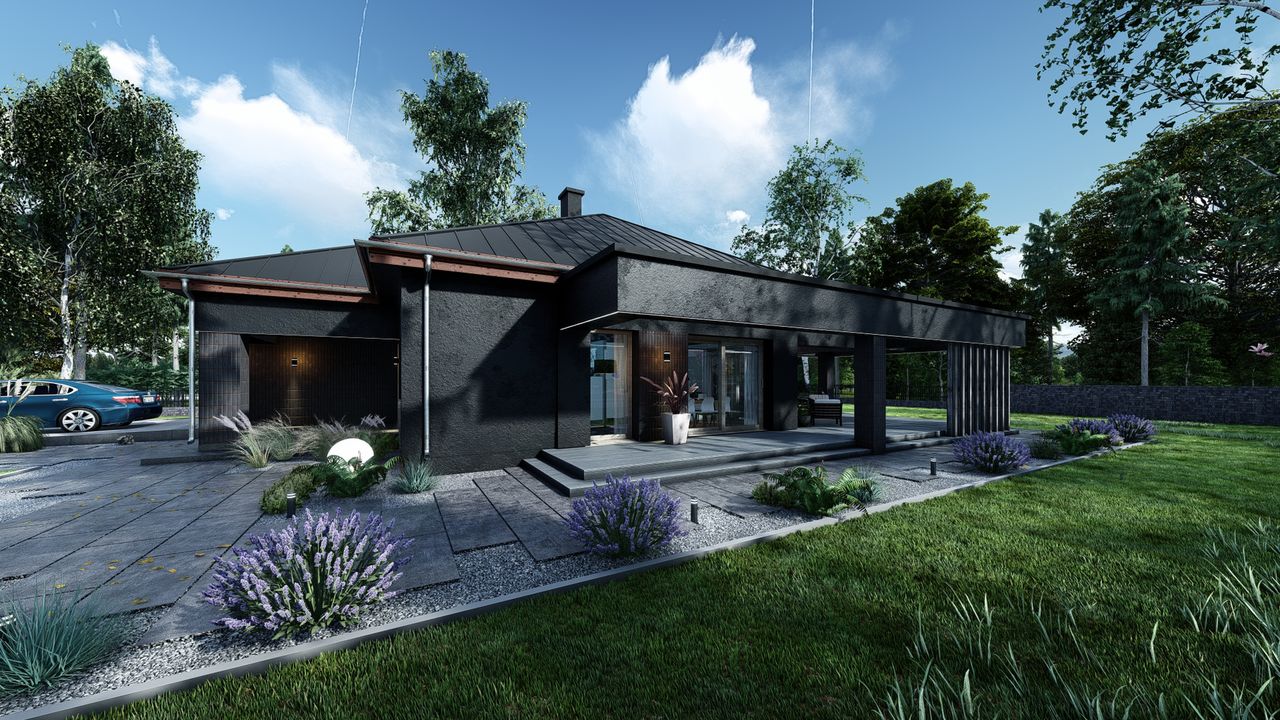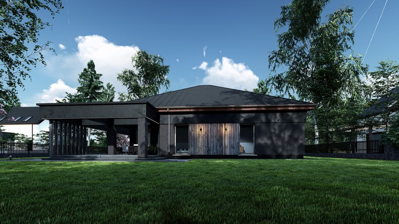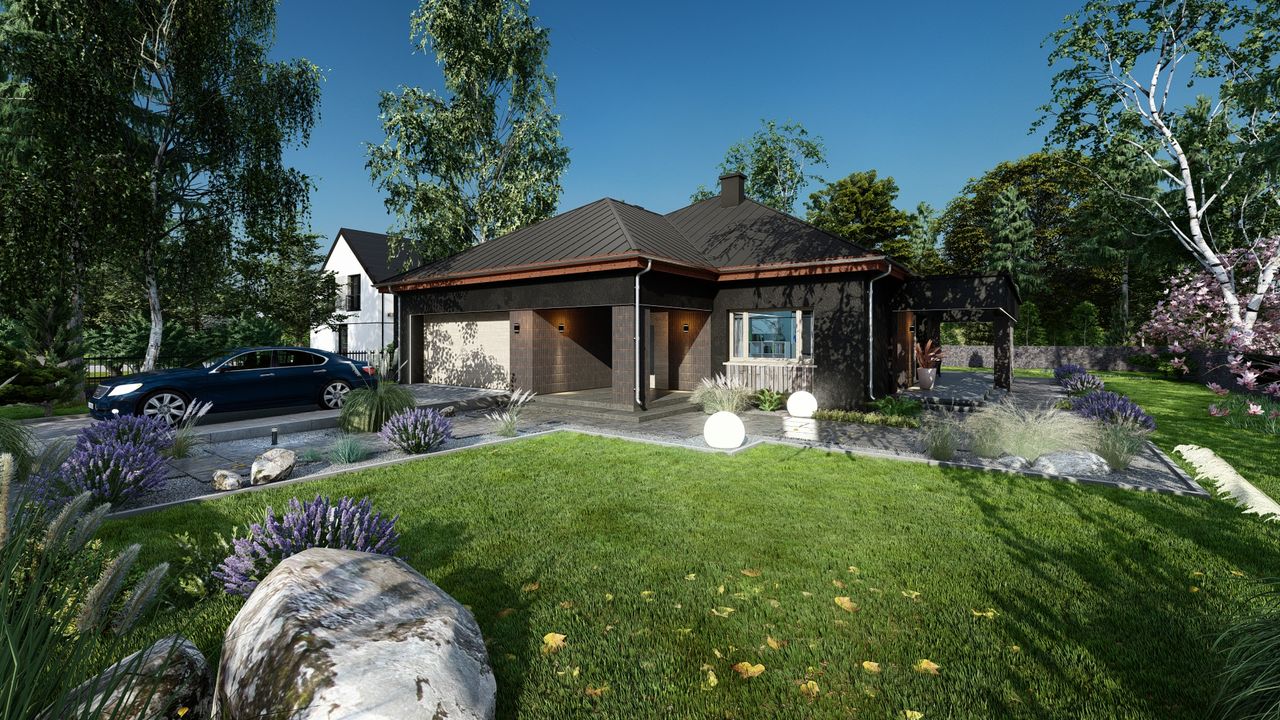 Graficzne opracowanie rzutów poglądowych widocznych na karcie projektu zostało wykonane przez Extradom.pl. Prezentowane przez Extradom.pl wizualizacje wykonane zostały przez autora projektu i należy poczytywać je jedynie za przykład i propozycję wykończenia, wizję architektoniczną autora projektu. Ostateczne wykończenie budynku może nastąpić na wiele sposobów. Szczegółowe rozwiązania zastosowane w oferowanej dokumentacji - w tym również ilość, lokalizacje i wygląd okien, drzwi, kominów - mogą w niewielkim stopniu różnić się od prezentowanej wizualizacji budynku.