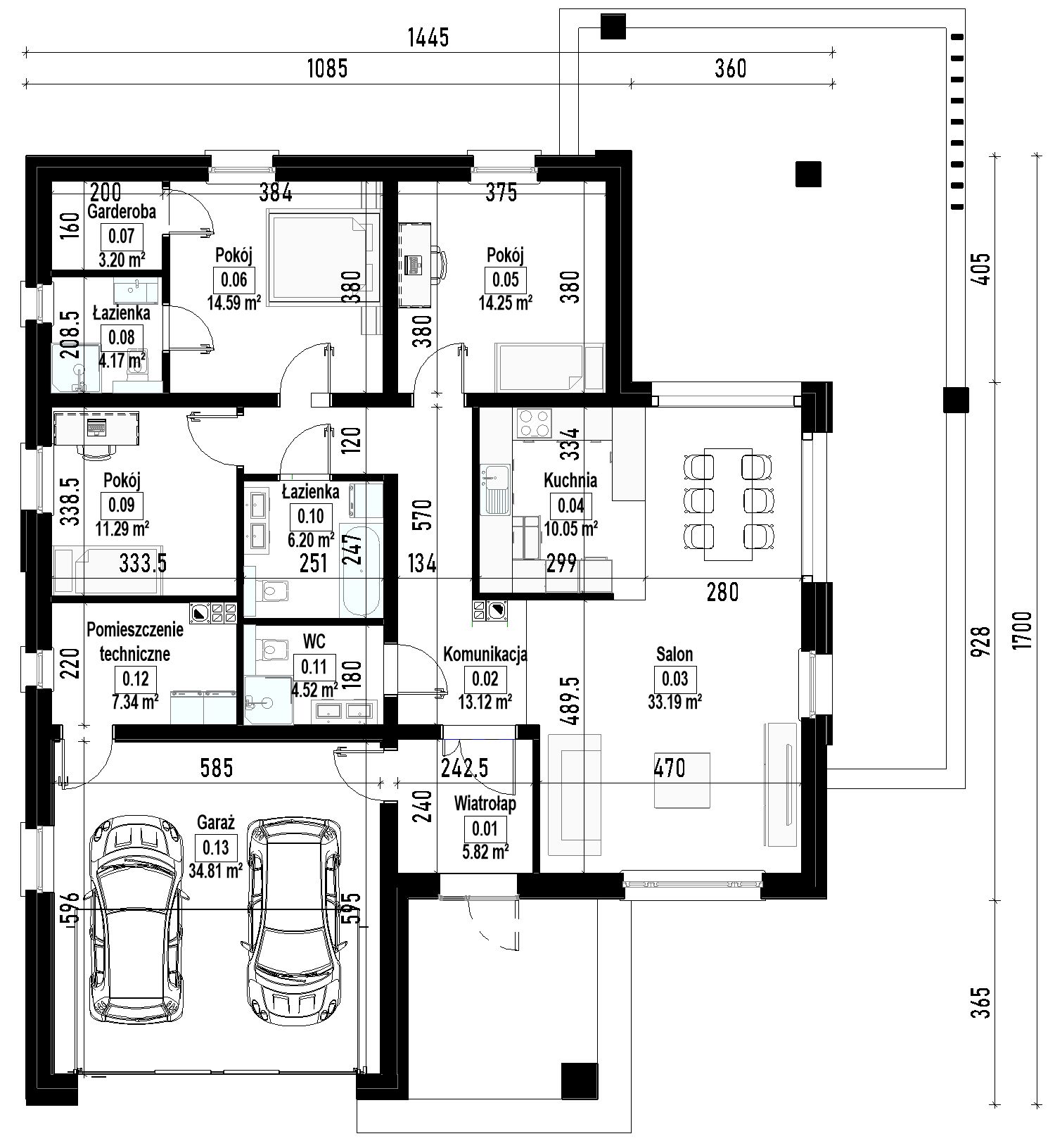Fundamenty: tradycyjne – ławy i stopy fundamentowe, ściany zewnętrzne: Porotherm + styropian 20 cm, elewacja: tynk biały, tynk czarny, deska elewacyjna, cegła, strop: drewniany, konstrukcja dachu: prefabrykowana kratownica drewniana, pokrycie dachówką lub blachą na rąbek, ogrzewanie: powietrzna pompa ciepła o mocy 6–7 kW typu powietrze–woda z ogrzewaniem podłogowym, wentylacja: grawitacyjna.