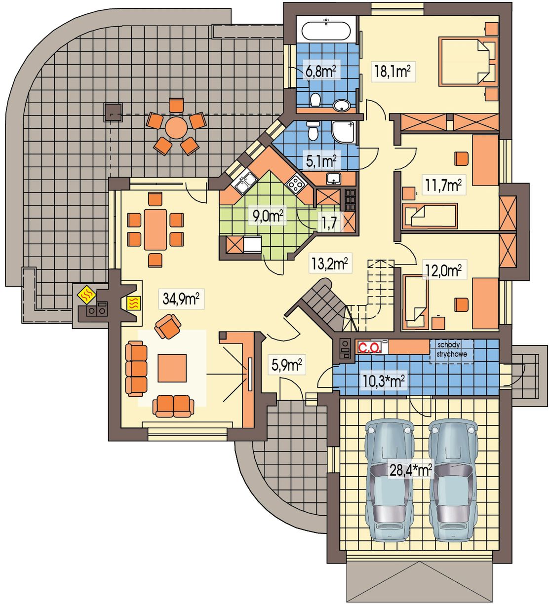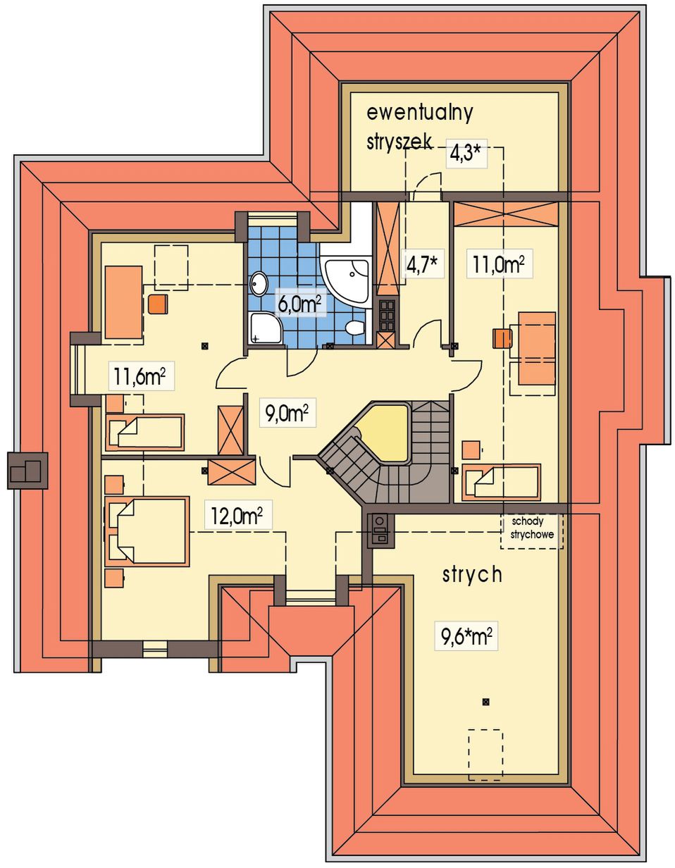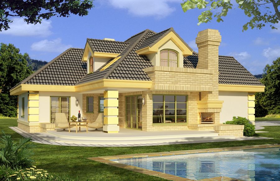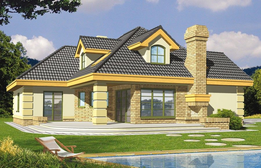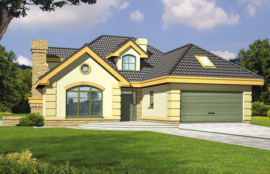 Graficzne opracowanie rzutów poglądowych widocznych na karcie projektu zostało wykonane przez Extradom.pl. Prezentowane przez Extradom.pl wizualizacje wykonane zostały przez autora projektu i należy poczytywać je jedynie za przykład i propozycję wykończenia, wizję architektoniczną autora projektu. Ostateczne wykończenie budynku może nastąpić na wiele sposobów. Szczegółowe rozwiązania zastosowane w oferowanej dokumentacji - w tym również ilość, lokalizacje i wygląd okien, drzwi, kominów - mogą w niewielkim stopniu różnić się od prezentowanej wizualizacji budynku.