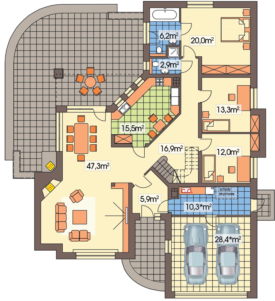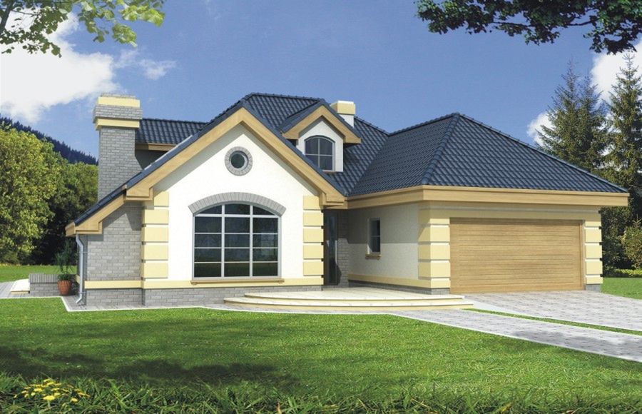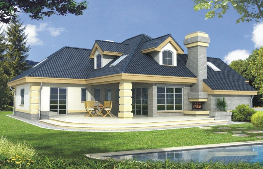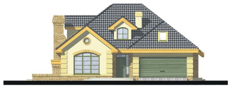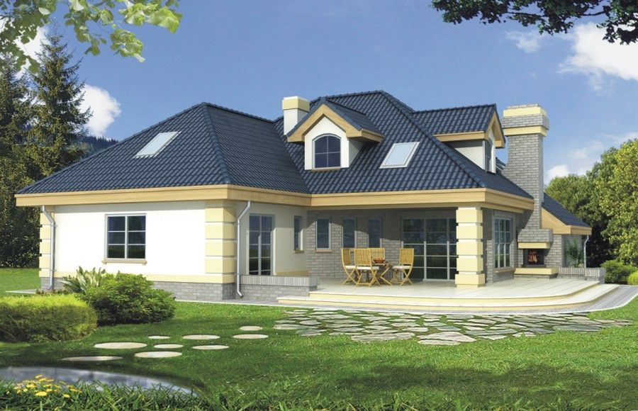 Graficzne opracowanie rzutów poglądowych widocznych na karcie projektu zostało wykonane przez Extradom.pl. Prezentowane przez Extradom.pl wizualizacje wykonane zostały przez autora projektu i należy poczytywać je jedynie za przykład i propozycję wykończenia, wizję architektoniczną autora projektu. Ostateczne wykończenie budynku może nastąpić na wiele sposobów. Szczegółowe rozwiązania zastosowane w oferowanej dokumentacji - w tym również ilość, lokalizacje i wygląd okien, drzwi, kominów - mogą w niewielkim stopniu różnić się od prezentowanej wizualizacji budynku.