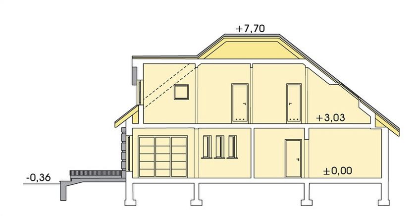 Strop: gęstożebrowy Teriva I. Ściany zewnętrzne: gazobeton 24cm + styropian 20cm. Pokrycie dachowe: dachówka ceramiczna. Okna połaciowe: Velux.