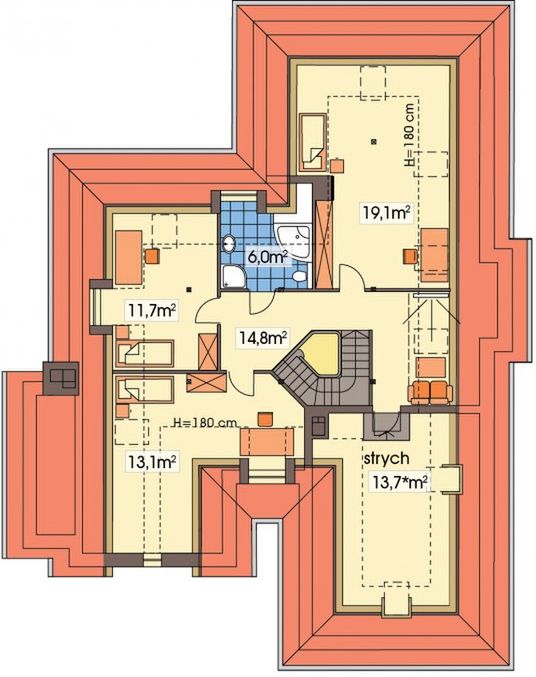 Strop: gęstożebrowy Teriva I. Ściany zewnętrzne: gazobeton 24cm + styropian 20cm. Pokrycie dachowe: dachówka ceramiczna. Okna połaciowe: Velux.
