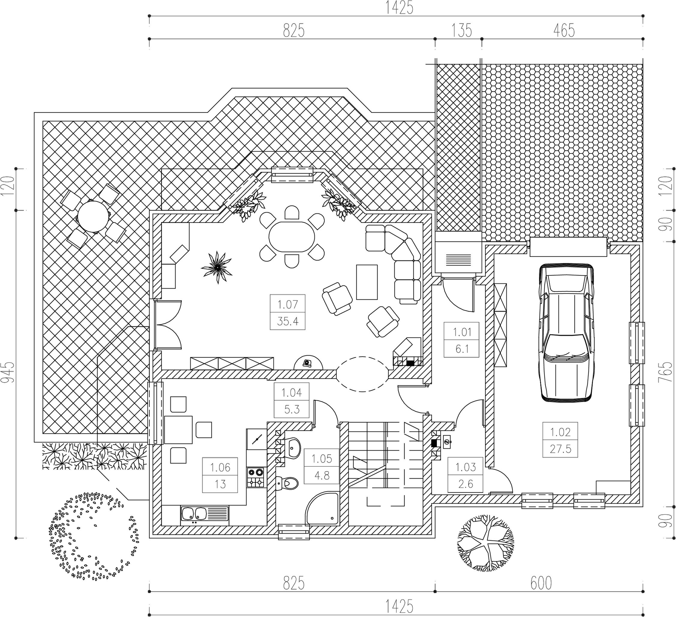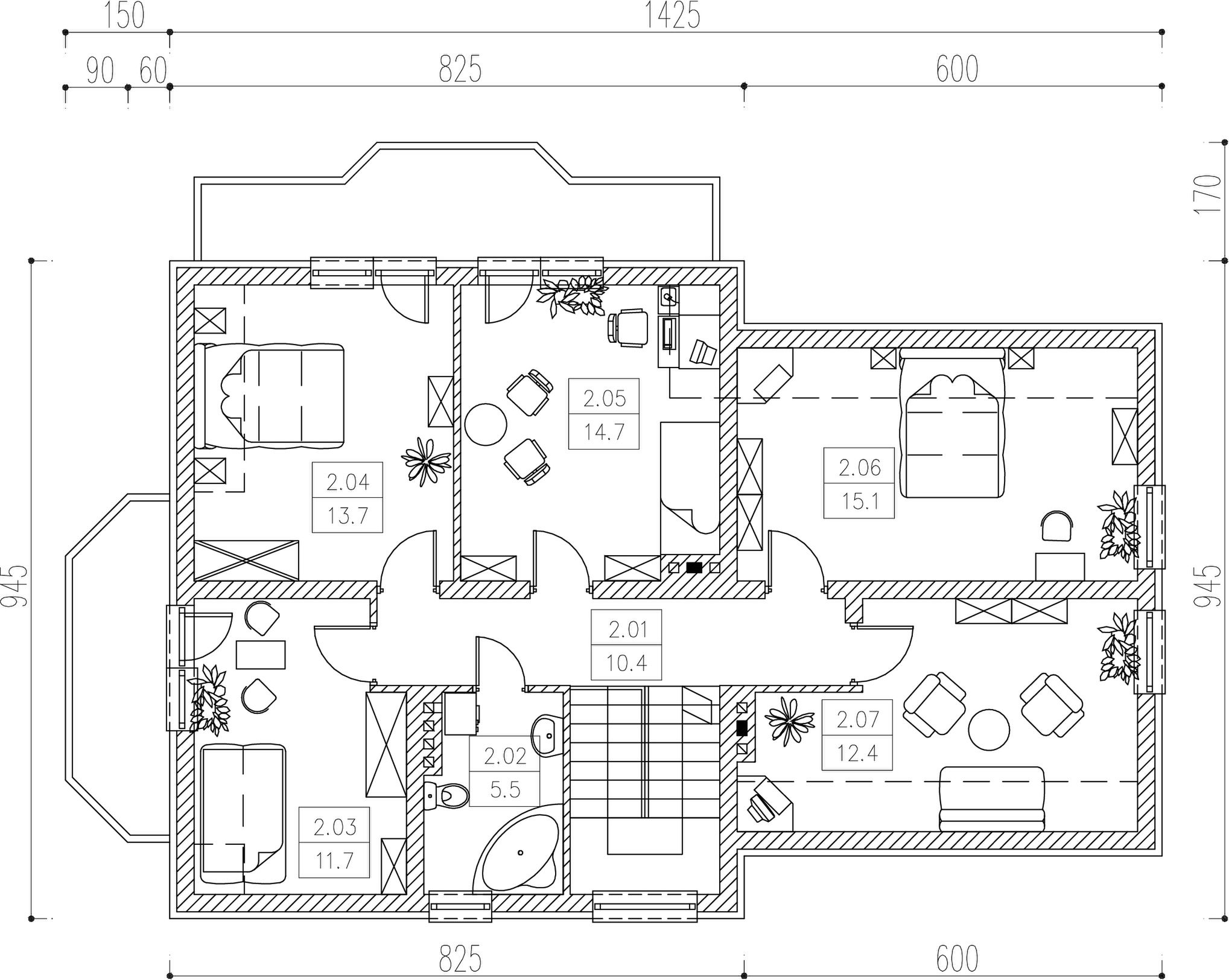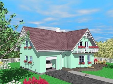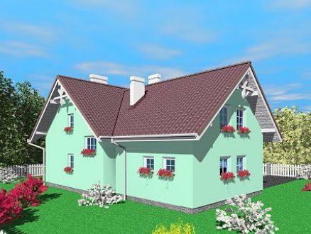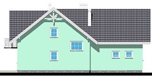 Graficzne opracowanie rzutów poglądowych widocznych na karcie projektu zostało wykonane przez Extradom.pl. Prezentowane przez Extradom.pl wizualizacje wykonane zostały przez autora projektu i należy poczytywać je jedynie za przykład i propozycję wykończenia, wizję architektoniczną autora projektu. Ostateczne wykończenie budynku może nastąpić na wiele sposobów. Szczegółowe rozwiązania zastosowane w oferowanej dokumentacji - w tym również ilość, lokalizacje i wygląd okien, drzwi, kominów - mogą w niewielkim stopniu różnić się od prezentowanej wizualizacji budynku.