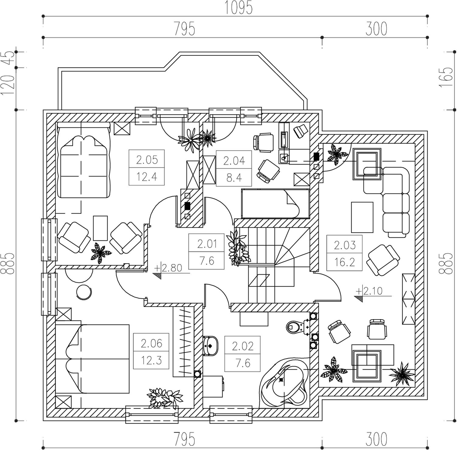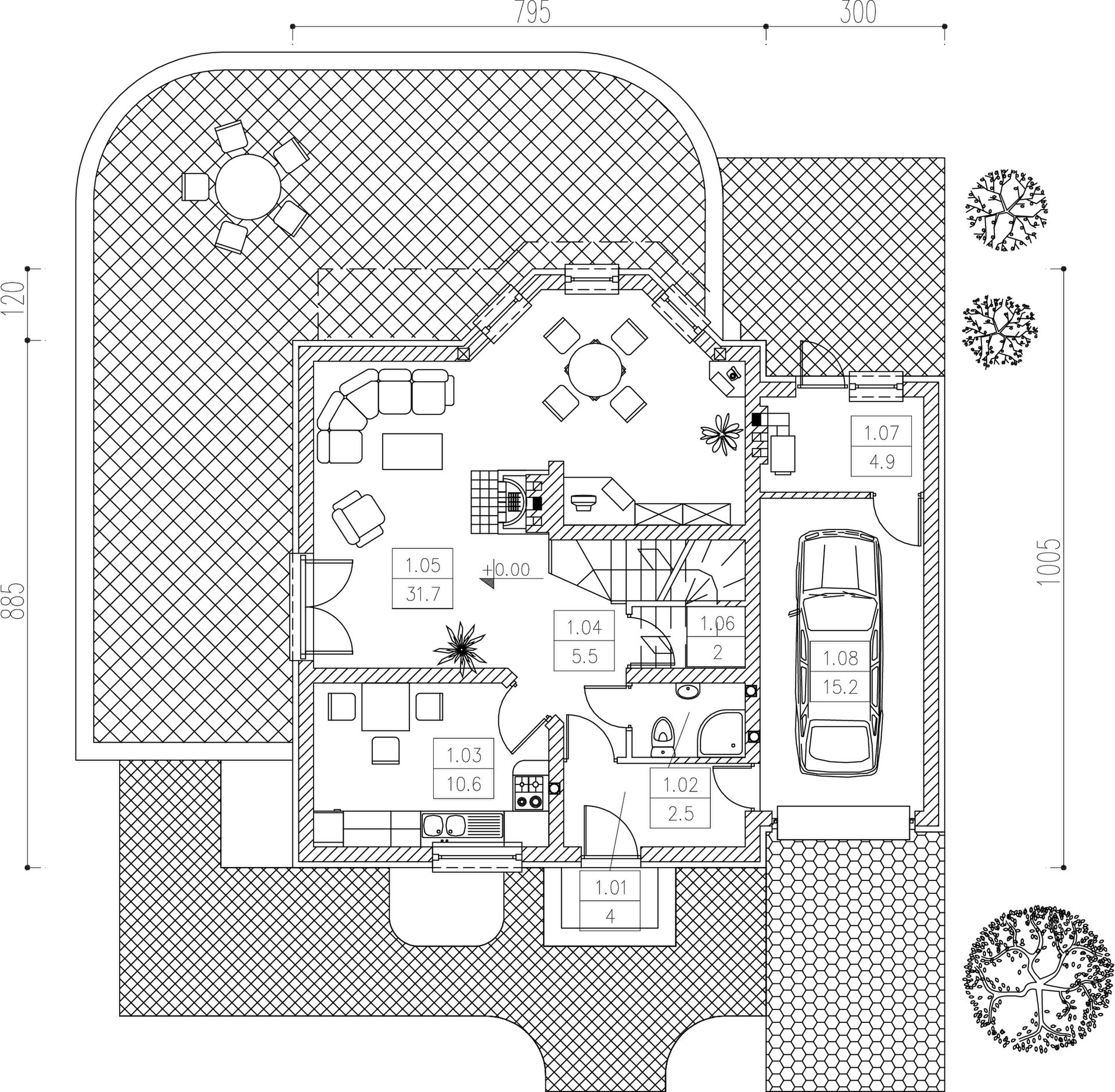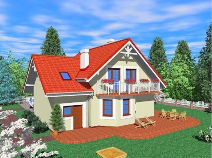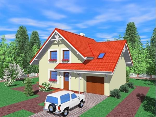Graficzne opracowanie rzutów poglądowych widocznych na karcie projektu zostało wykonane przez Extradom.pl. Prezentowane przez Extradom.pl wizualizacje wykonane zostały przez autora projektu i należy poczytywać je jedynie za przykład i propozycję wykończenia, wizję architektoniczną autora projektu. Ostateczne wykończenie budynku może nastąpić na wiele sposobów. Szczegółowe rozwiązania zastosowane w oferowanej dokumentacji - w tym również ilość, lokalizacje i wygląd okien, drzwi, kominów - mogą w niewielkim stopniu różnić się od prezentowanej wizualizacji budynku.