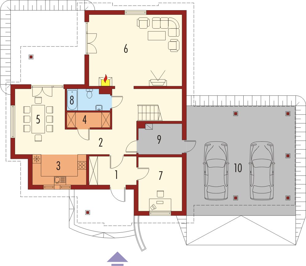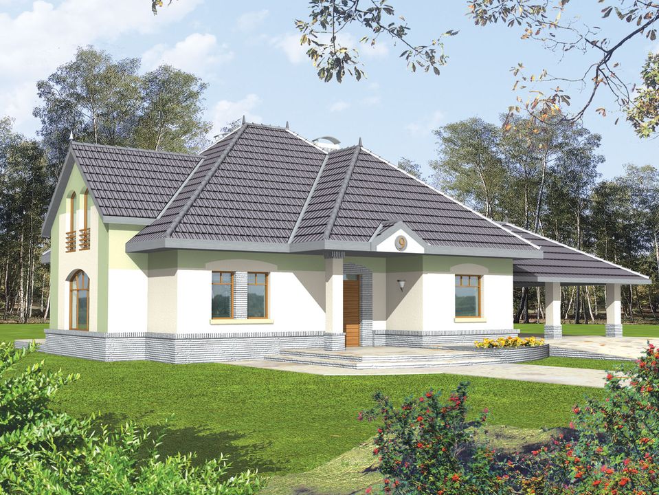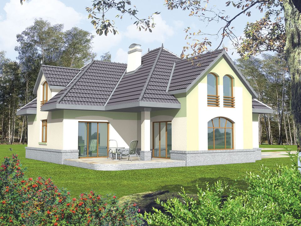 Graficzne opracowanie rzutów poglądowych widocznych na karcie projektu zostało wykonane przez Extradom.pl. Prezentowane przez Extradom.pl wizualizacje wykonane zostały przez autora projektu i należy poczytywać je jedynie za przykład i propozycję wykończenia, wizję architektoniczną autora projektu. Ostateczne wykończenie budynku może nastąpić na wiele sposobów. Szczegółowe rozwiązania zastosowane w oferowanej dokumentacji - w tym również ilość, lokalizacje i wygląd okien, drzwi, kominów - mogą w niewielkim stopniu różnić się od prezentowanej wizualizacji budynku.