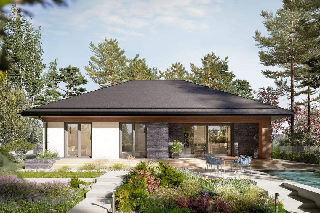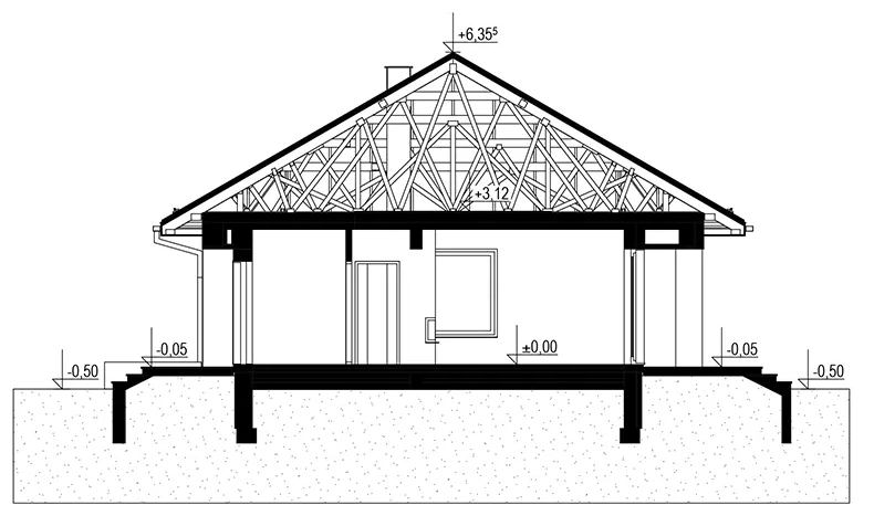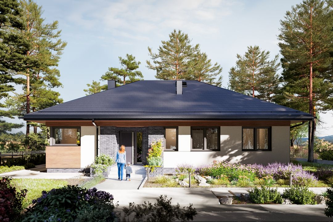 Wersja technologiczna: murowana - beton komórkowy. Izolacja termiczna ścian zewnętrznych: Termo Organika TERMONIUM FASADA / alternatywnie Gór-Stal płyta izolacyjna termPIR ETX. Strop: dolny pas wiązarów MITEK. Typ schodów: brak. Konstrukcja dachu: prefabrykowane wiązary drewniane MITEK Industries Polska. Pokrycie dachowe: blacha na rąbek. Typ ogrzewania: Kocioł na gaz. Dostępna wersja z pompą ciepła: Tak. Dostępna wersja z fotowoltaiką: Tak. Wentylacja: mechaniczna. Ściany zewnętrzne: 24 cm beton komórkowy Solbat Optimal. Ściany wewnętrzne: 24 cm beton komórkowy Solbet Optimal. Ściany wewnętrzne działowe: 12 cm beton komórkowy Solbet One. Wentylacja: mechaniczna Heatpex Aria.
