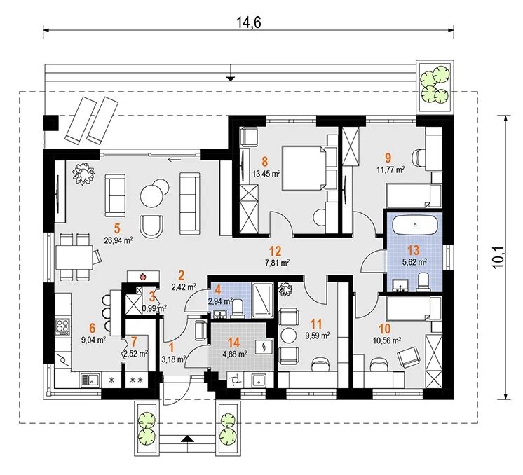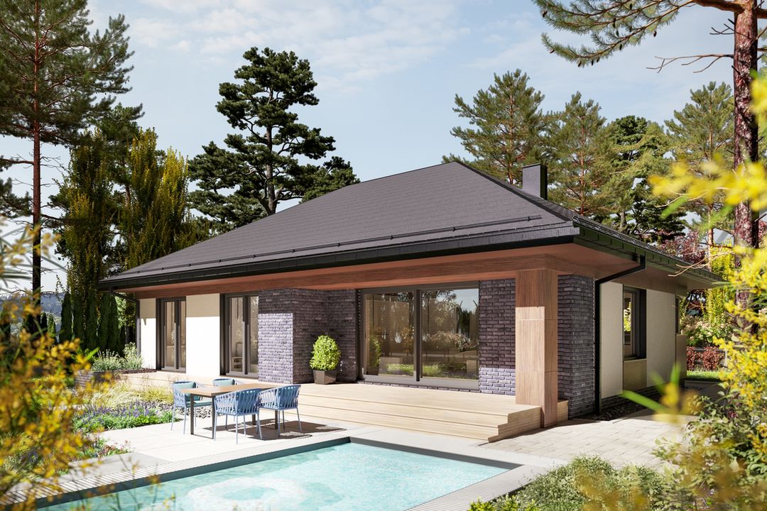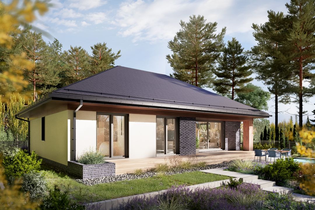 Graficzne opracowanie rzutów poglądowych widocznych na karcie projektu zostało wykonane przez Extradom.pl. Prezentowane przez Extradom.pl wizualizacje wykonane zostały przez autora projektu i należy poczytywać je jedynie za przykład i propozycję wykończenia, wizję architektoniczną autora projektu. Ostateczne wykończenie budynku może nastąpić na wiele sposobów. Szczegółowe rozwiązania zastosowane w oferowanej dokumentacji - w tym również ilość, lokalizacje i wygląd okien, drzwi, kominów - mogą w niewielkim stopniu różnić się od prezentowanej wizualizacji budynku.